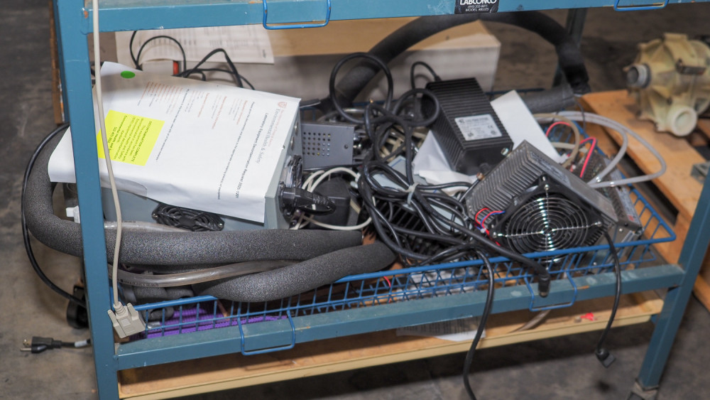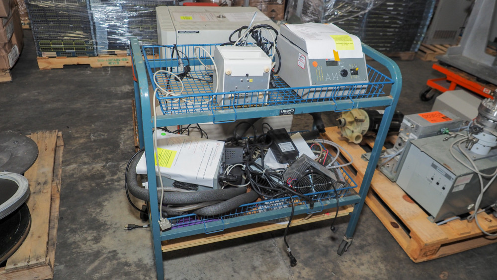 Rolling cart with mixed lab and electronic equipment including peristaltic pump, Jouan benchtop centrifuge, AEI Technologies Flow Control R-1, variable-flow chemical pump, TE Technology LC-061 temperature control module, and other components; cart approx. 18" x 35" x 36". *The University of Texas at Austin makes no claim of physical or mechanical condition, and functionality of items available through SWICO Auctions. All items are sold “As is, where is”. It is the sole responsibility of the bidder to physically inspect items before bidding and assume all risk. Photos and descriptions are for preview only. All sales are final and no refunds will be issued. Please refer to the SWICO “Terms of Service” in which you have agreed to.