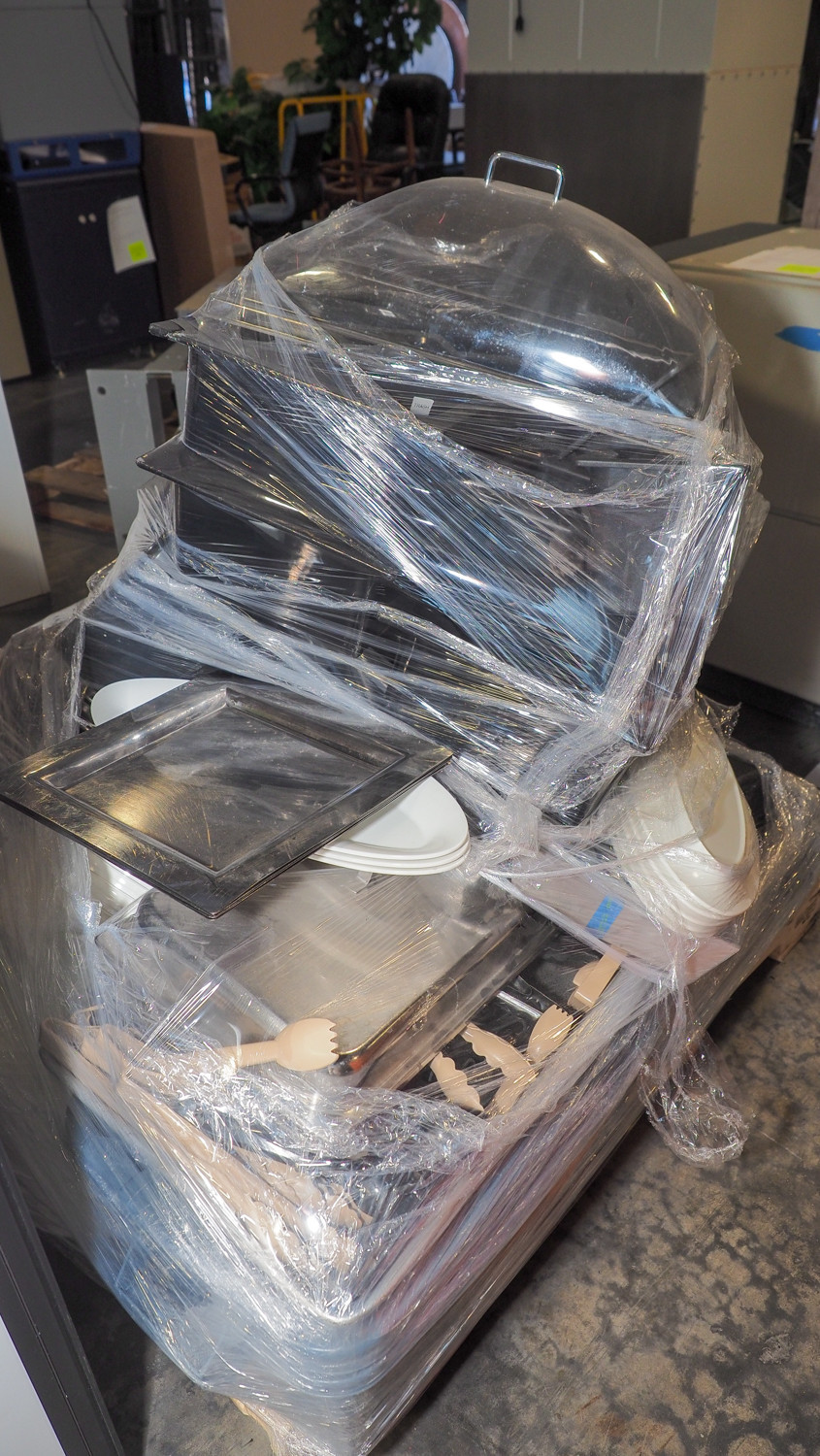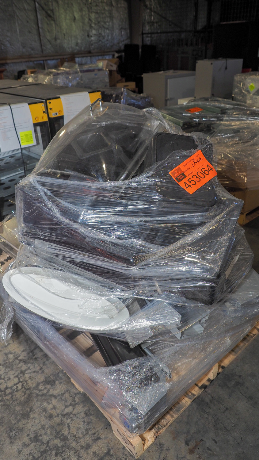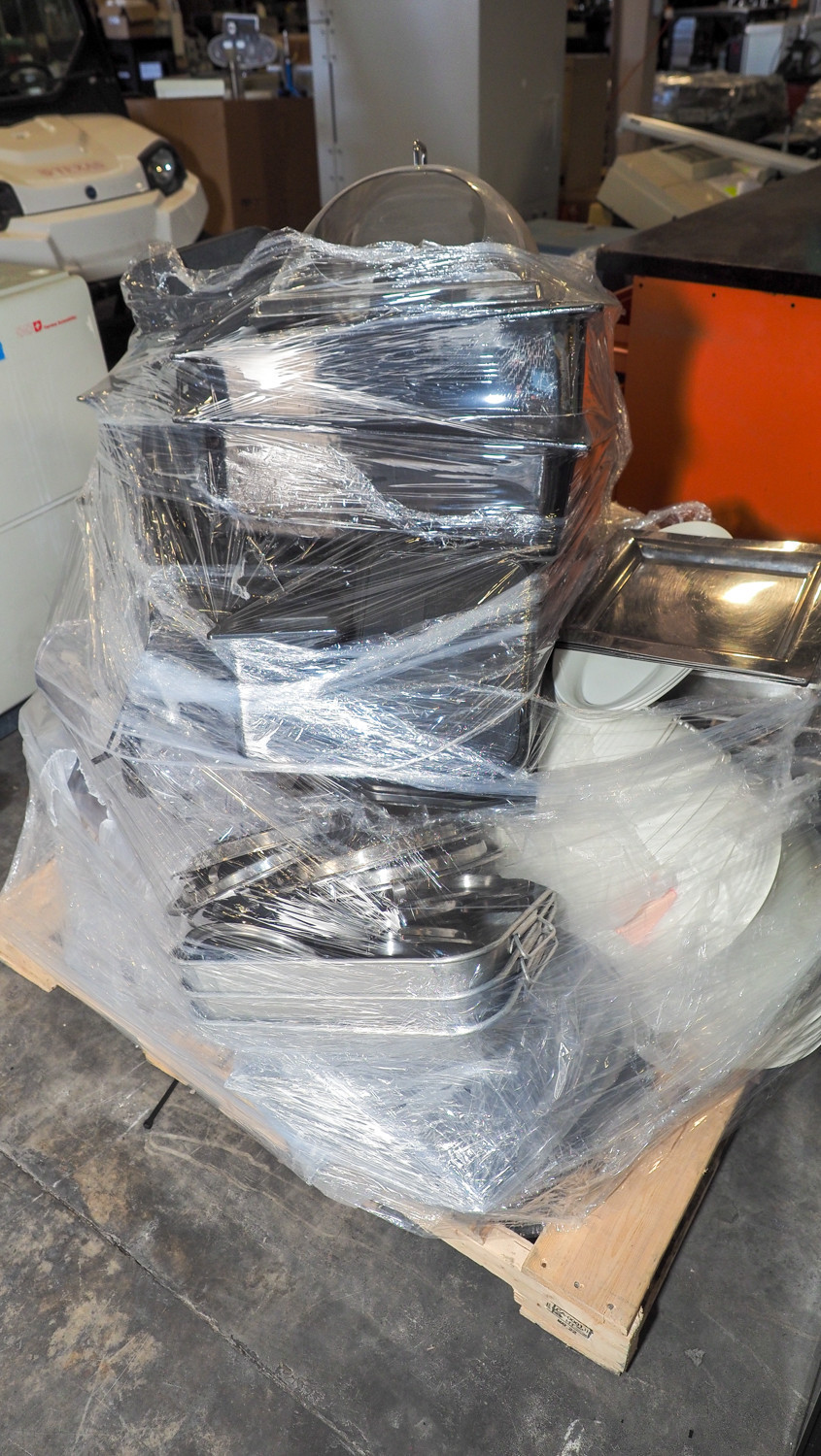 Pallet of commercial kitchen accessories including stainless serving wells, stainless pans, coated serving wells, plastic condiment or utensil dispensers, and additional food-service components. *The University of Texas at Austin makes no claim of physical or mechanical condition, and functionality of items available through SWICO Auctions. All items are sold “As is, where is”. It is the sole responsibility of the bidder to physically inspect items before bidding and assume all risk. Photos and descriptions are for preview only. All sales are final and no refunds will be issued. Please refer to the SWICO “Terms of Service” in which you have agreed to.