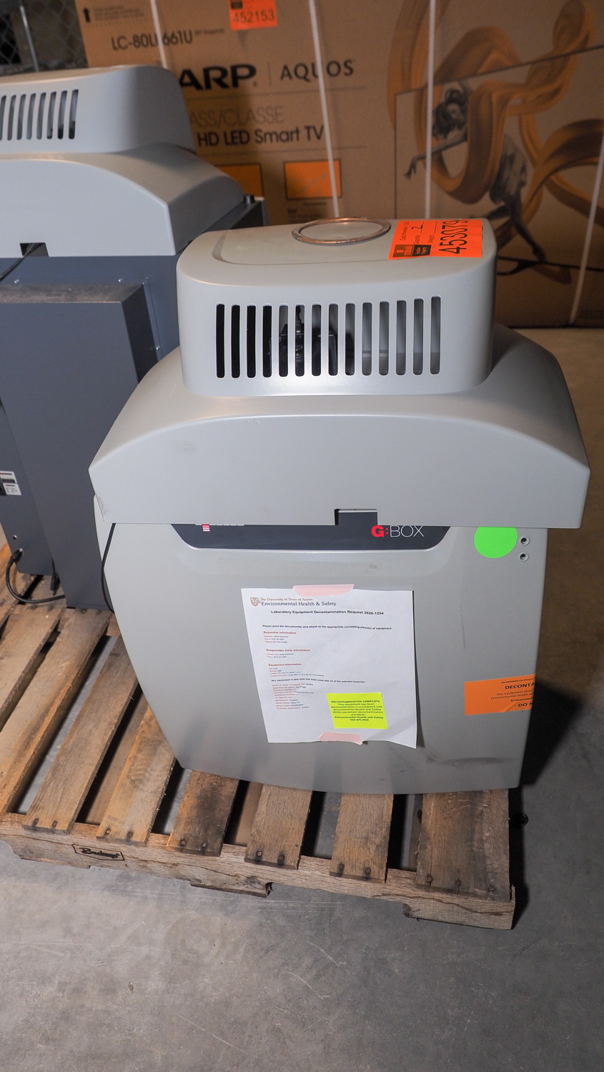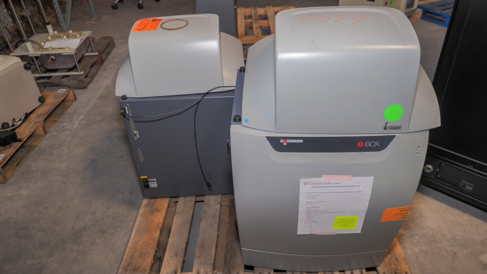Pallet of lab equipment including Syngene imaging unit(s) (G:BOX or similar), additional Syngene/gel documentation components, and other small lab electronics; *The University of Texas at Austin makes no claim of physical or mechanical condition, and functionality of items available through SWICO Auctions. All items are sold “As is, where is”. It is the sole responsibility of the bidder to physically inspect items before bidding and assume all risk. Photos and descriptions are for preview only. All sales are final and no refunds will be issued. Please refer to the SWICO “Terms of Service” in which you have agreed to.
