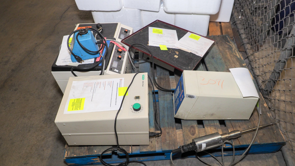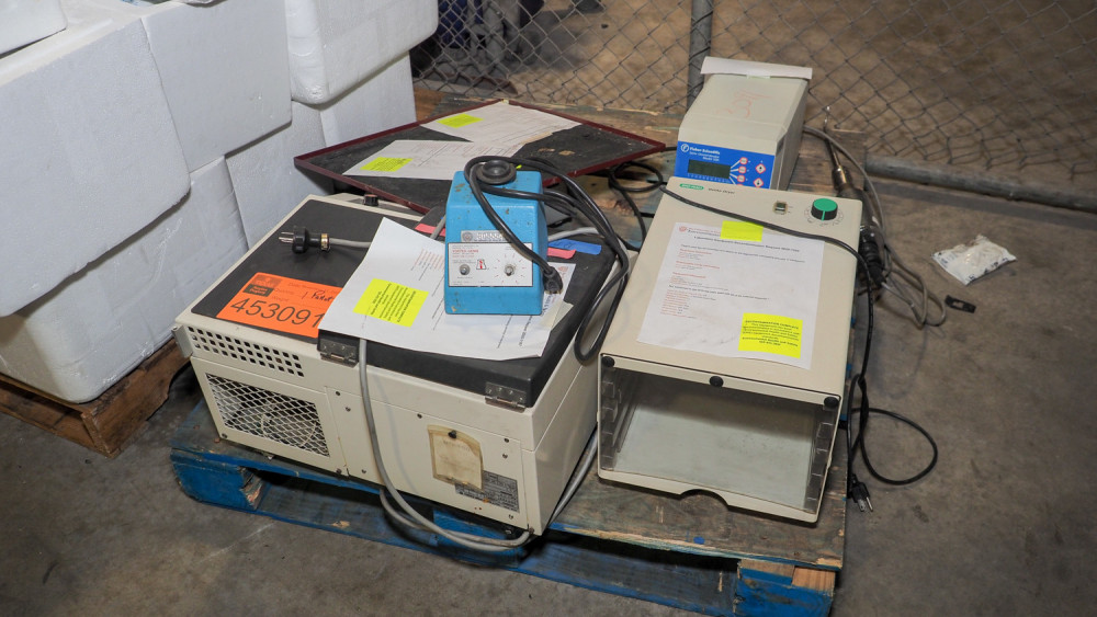 Pallet of lab equipment including Biora gel air dryer, Scientific Industries Vortex-Genie mixer, TOMY centrifuge, Peninsula Labs MTX-150 centrifuge, Fisher Sonic Dismembrator model 500, shaker table, and additional small devices. Condition:Conditions unknown *The University of Texas at Austin makes no claim of physical or mechanical condition, and functionality of items available through SWICO Auctions. All items are sold “As is, where is”. It is the sole responsibility of the bidder to physically inspect items before bidding and assume all risk. Photos and descriptions are for preview only. All sales are final and no refunds will be issued. Please refer to the SWICO “Terms of Service” in which you have agreed to.