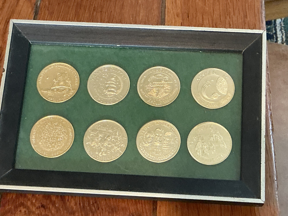 Eight coins in a framed case celebrating the Apollo flights 11-12-13-14.