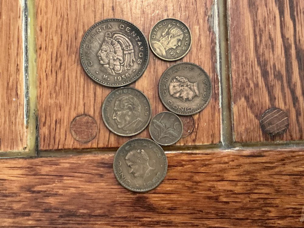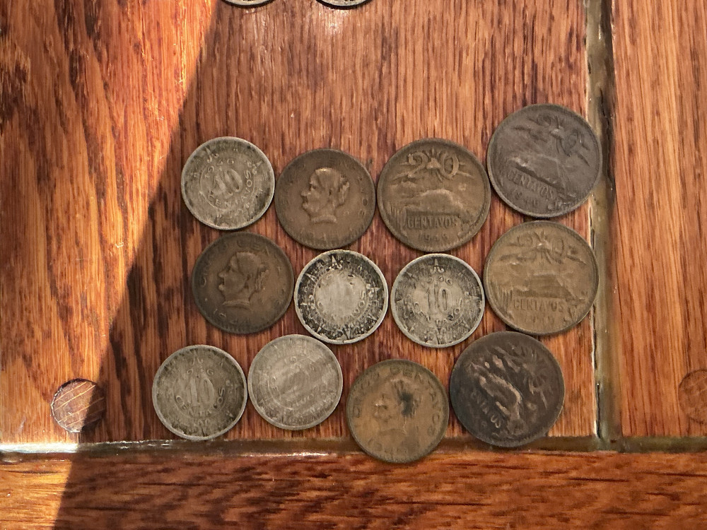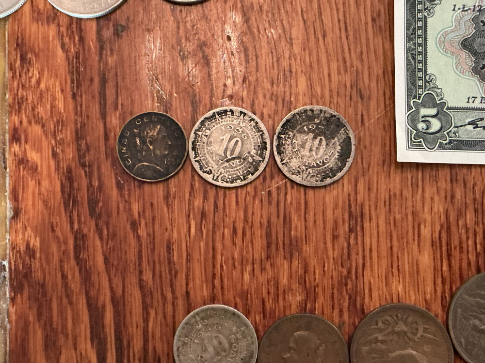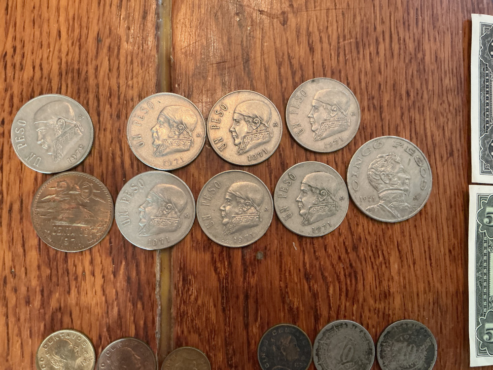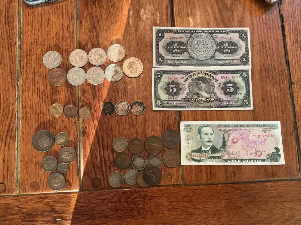 Coins from 1930’s; 1940’s; 1950’s; 1960’s and 1970. Plus Uno and Cinco Peso paper money. Includes special Cinco Colones from Costa Rica from8 de mayo de 1972