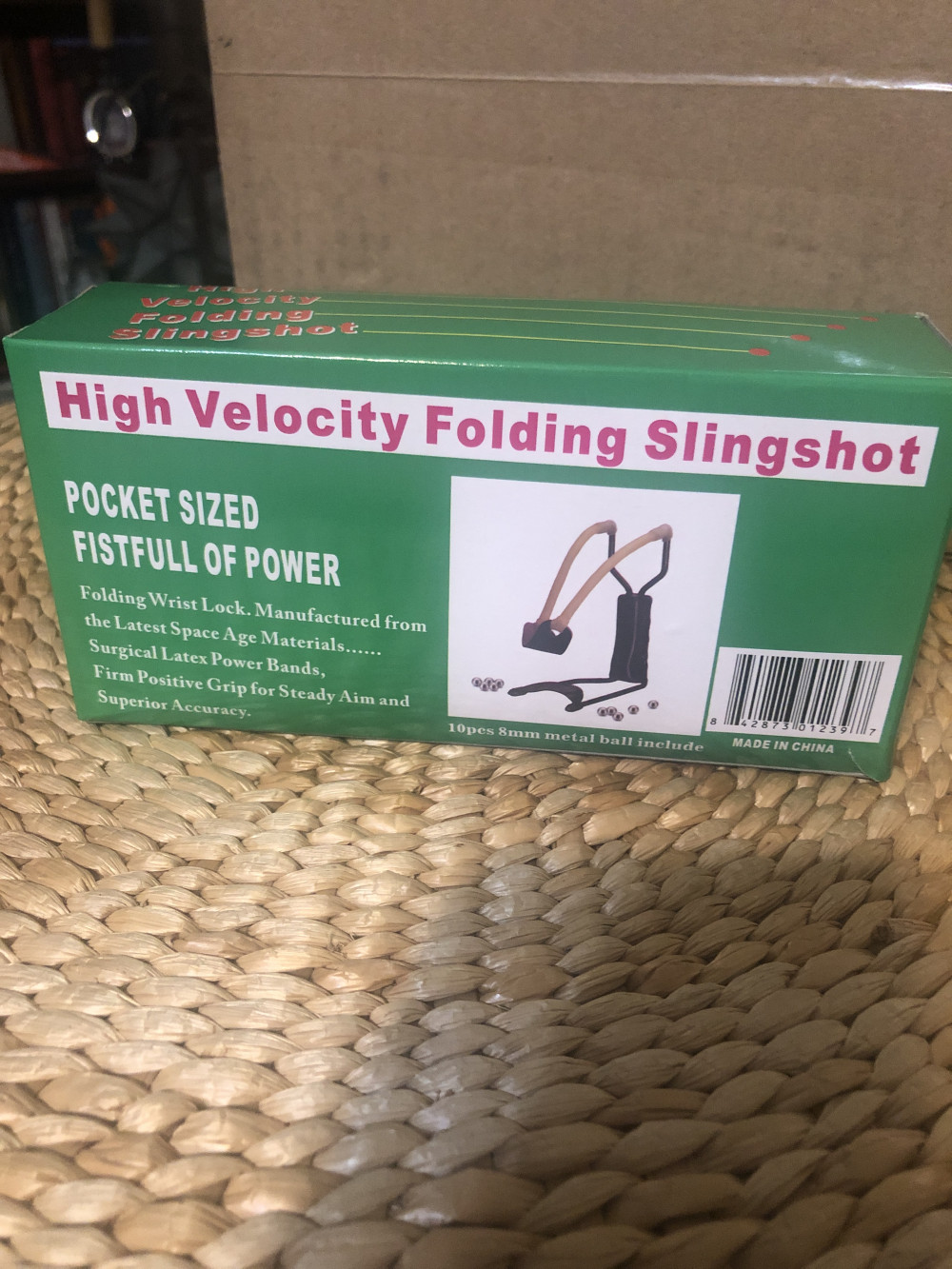 New, in box, high. Elocityfolding slingshot. Pocket sized.