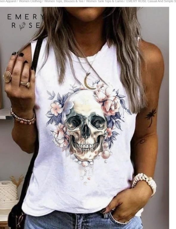 Casual And Simple Skull Head Watercolor Floral Pattern Loose-Fit Sleeveless Tank Top Size Large Great Deals and Steal