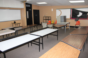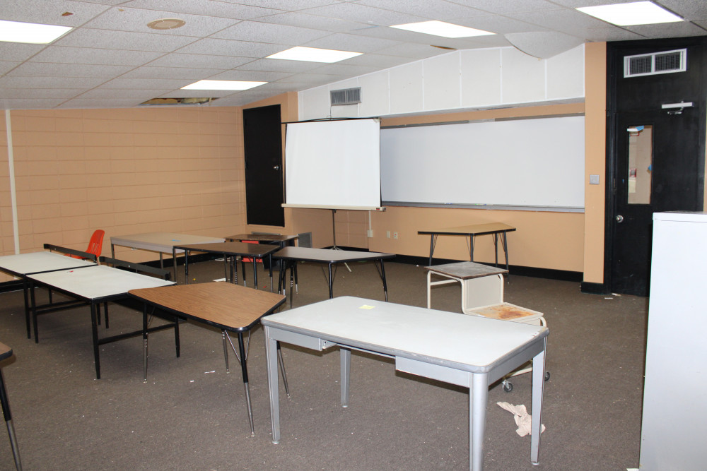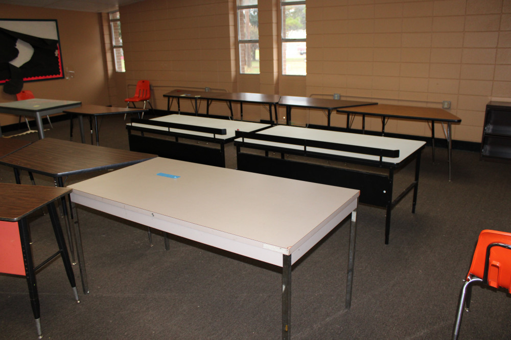 Everything in the room. Assorted desks, tables, chairs, and random classroom furniture.