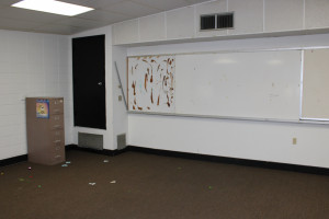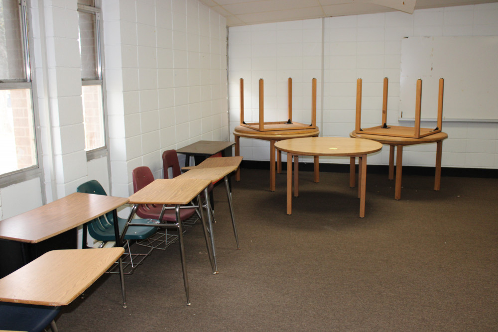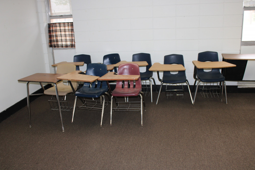 Everything in the room. Assorted desks, tables, chairs, and random classroom furniture.