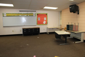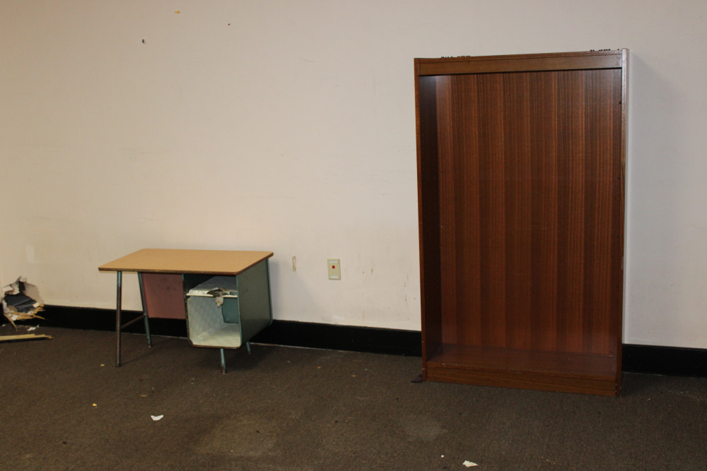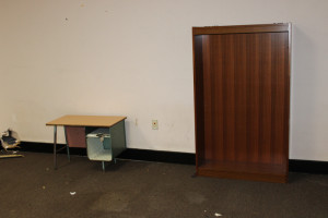 Everything in the room. Assorted desks, tables, chairs, and random classroom furniture.