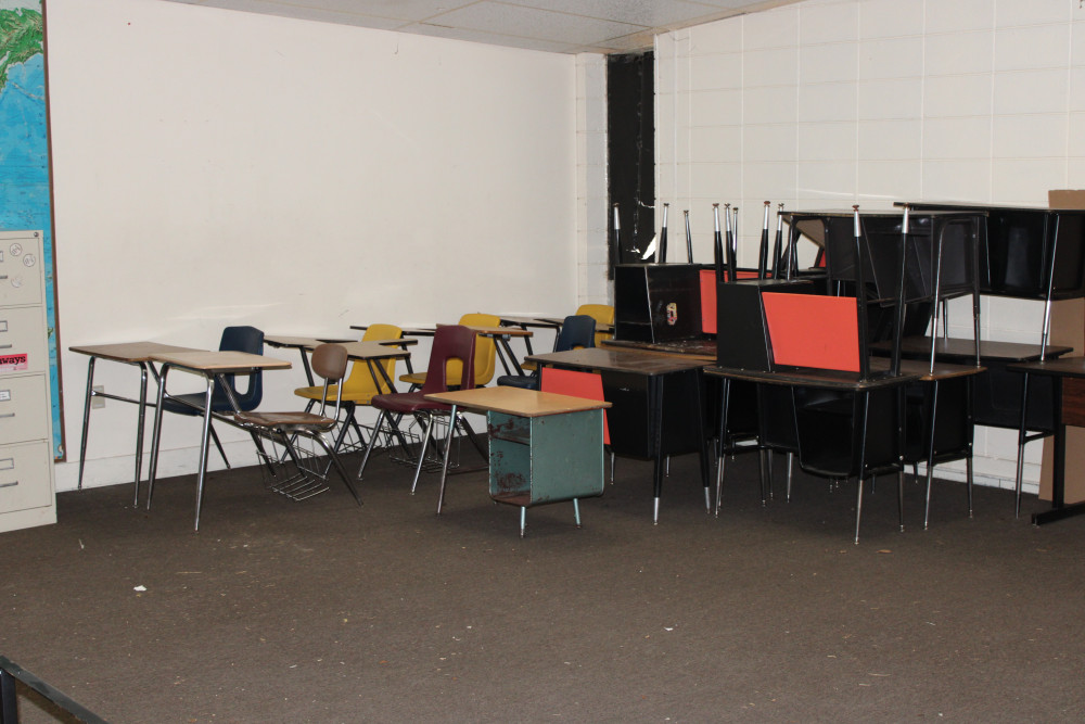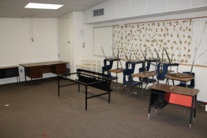 Everything in the room. Assorted desks, tables, chairs, and random classroom furniture.