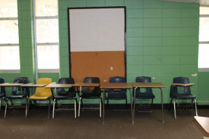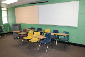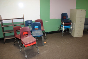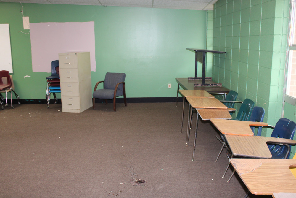 Everything in the room. Assorted desks, tables, chairs, and random classroom furniture.