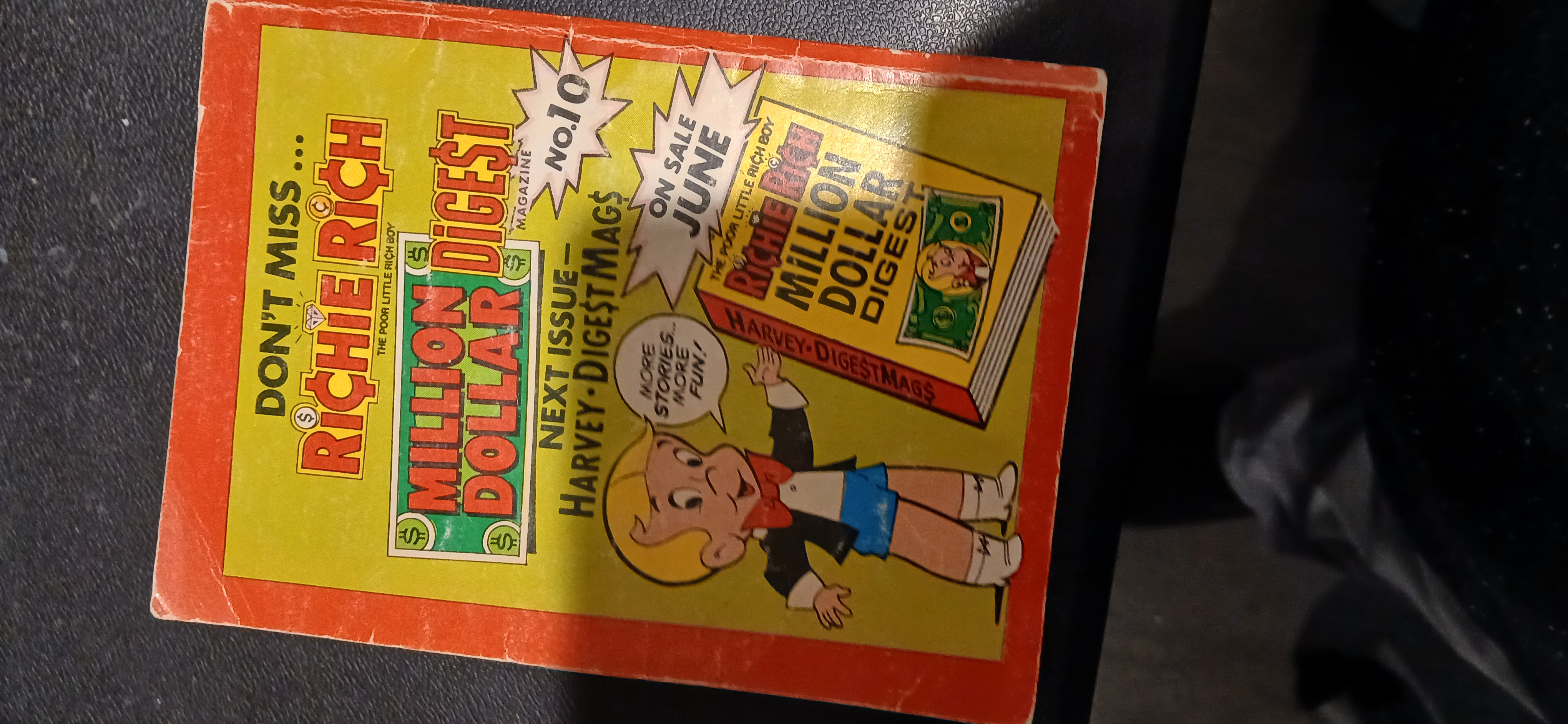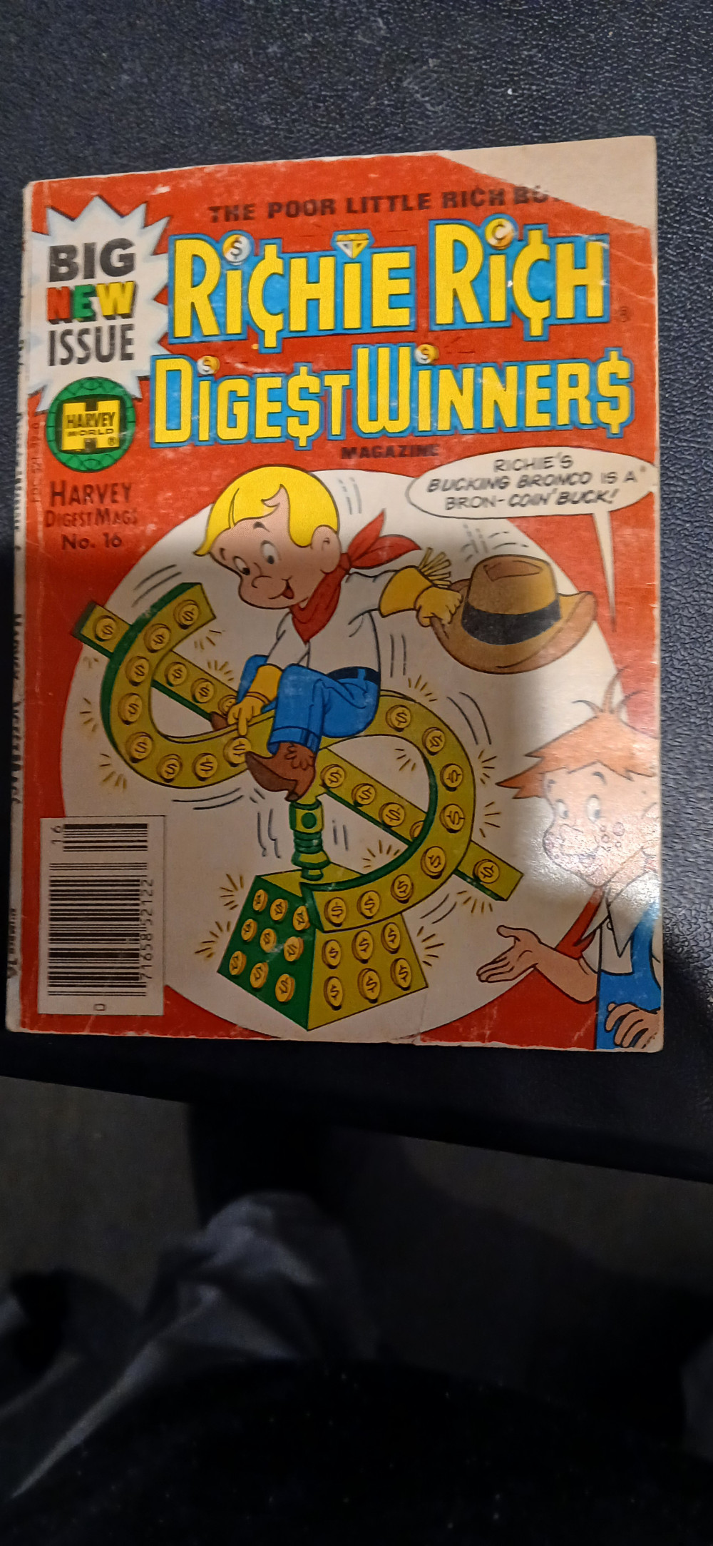 This is for a well used Richie Rich Comic book Digest Winners Harvey digest Mag$ no. 16 . Original new cost back in Nov 1982 was .95 cents. No writing in it, the original price is torn off, the binding at bottom is torn a little. Creased where you turn the pages over while reading. Still a neat collectible.