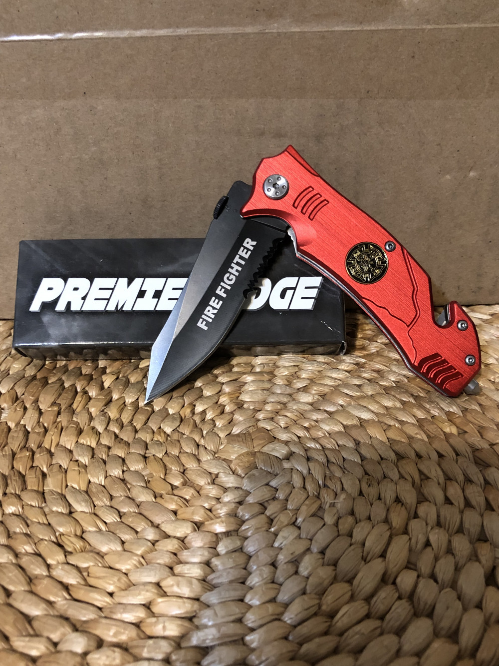 New in box red Premier Edge Firefighter knife with clip, seatbelt cutter and glass punch.