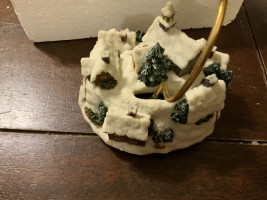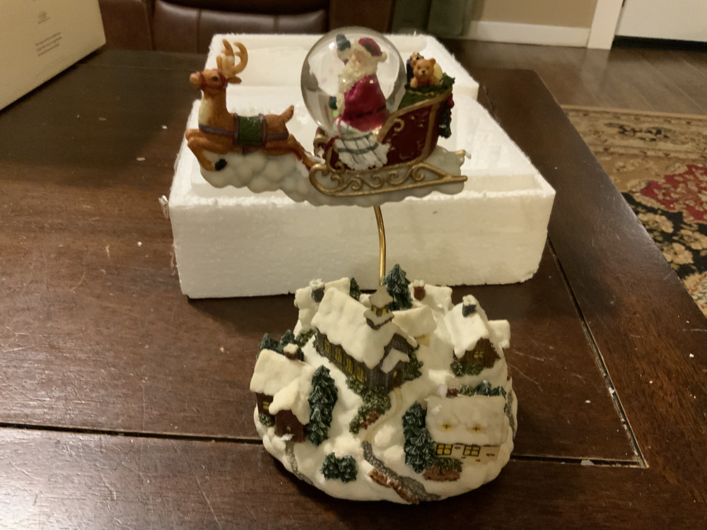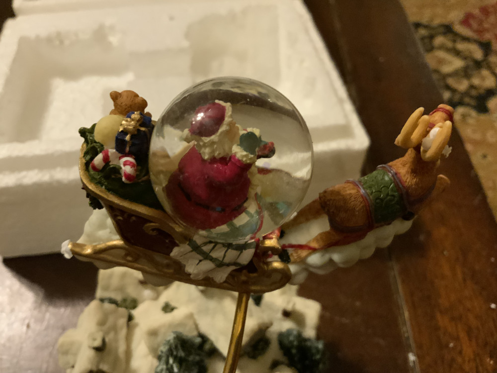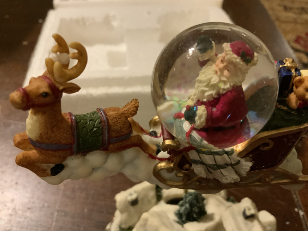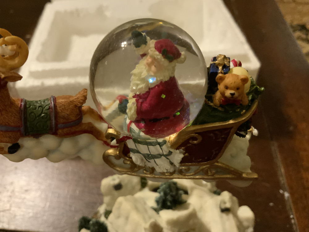 Music figurine of Santa in snow globe It is about 8” tall.Plays Santa Claus is coming to town. Sleigh goes back & forth.
