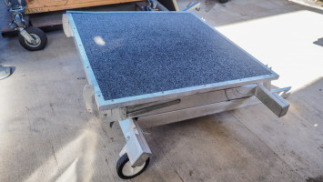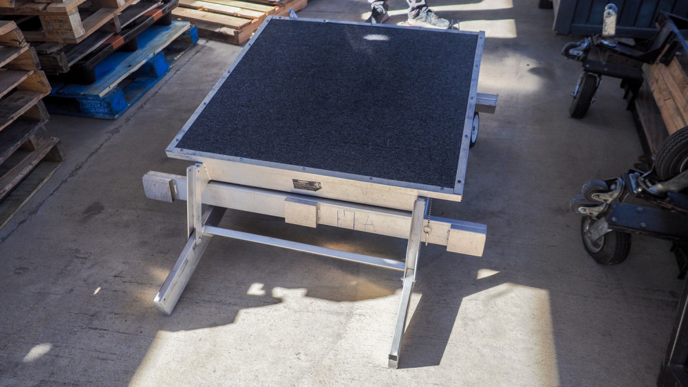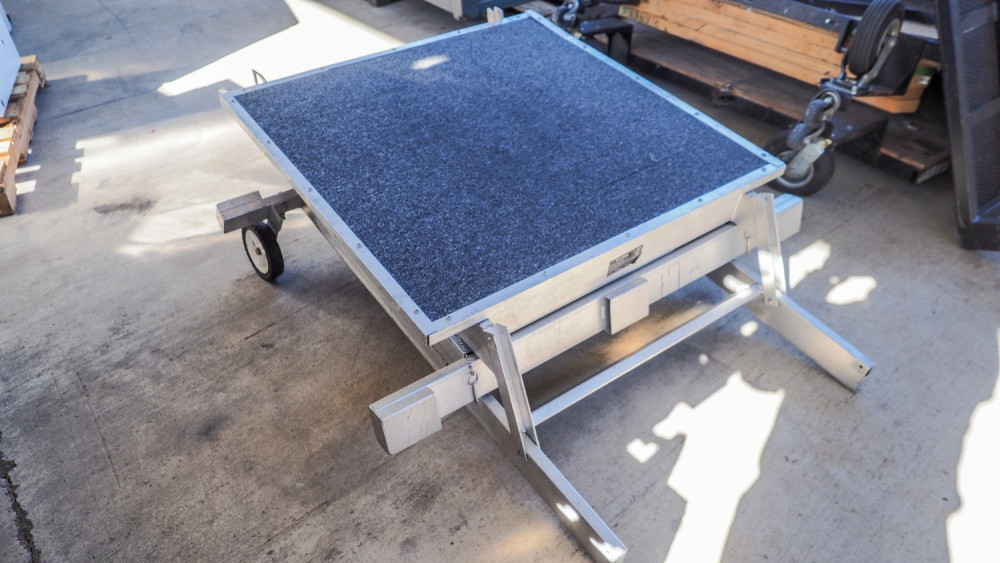 Aluminum portable platform with 38 in × 38 in deck, 4 ft tall. Tough Carts 12 in portable stand with 36 in × 33 in deck. Rolling foldable deck with 5 ft × 8 ft deck. Condition:Rolling foldable deck is missing one pneumatic tire. Other tires are flat.