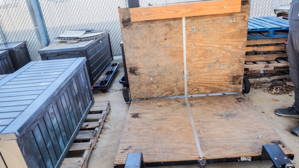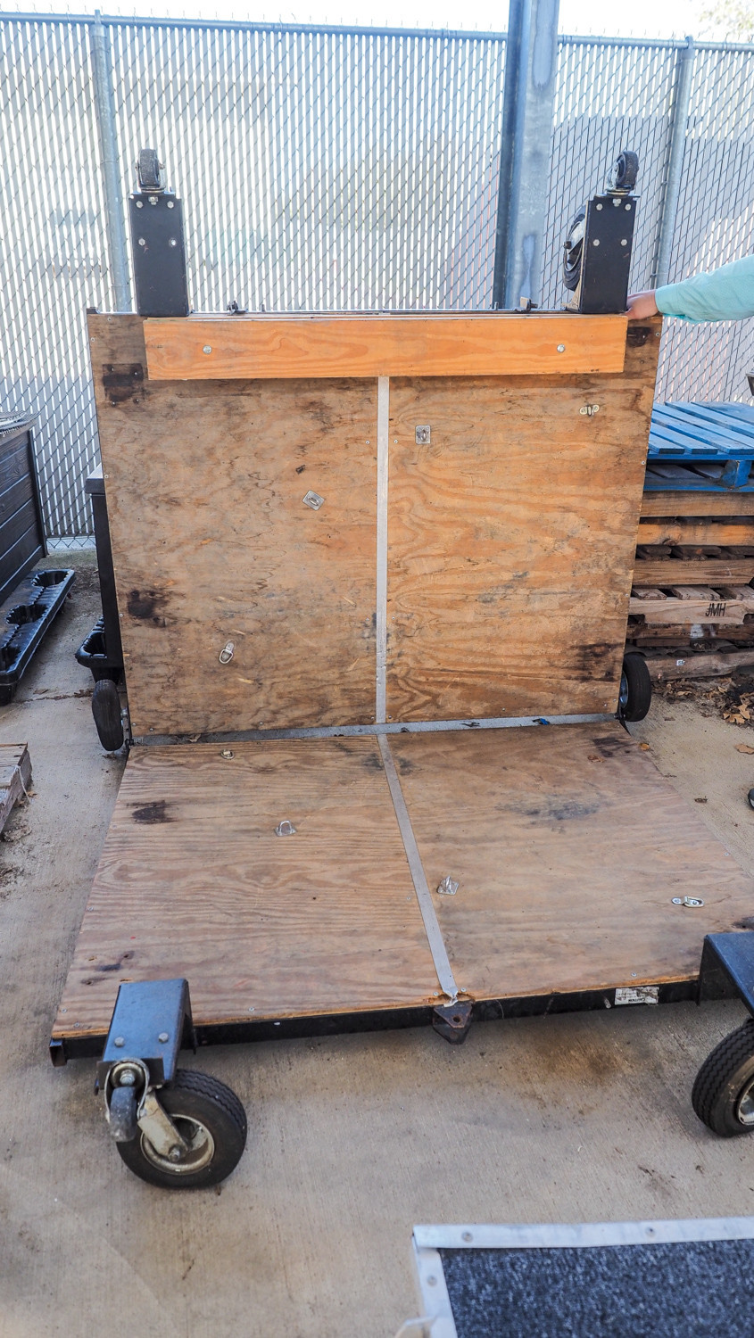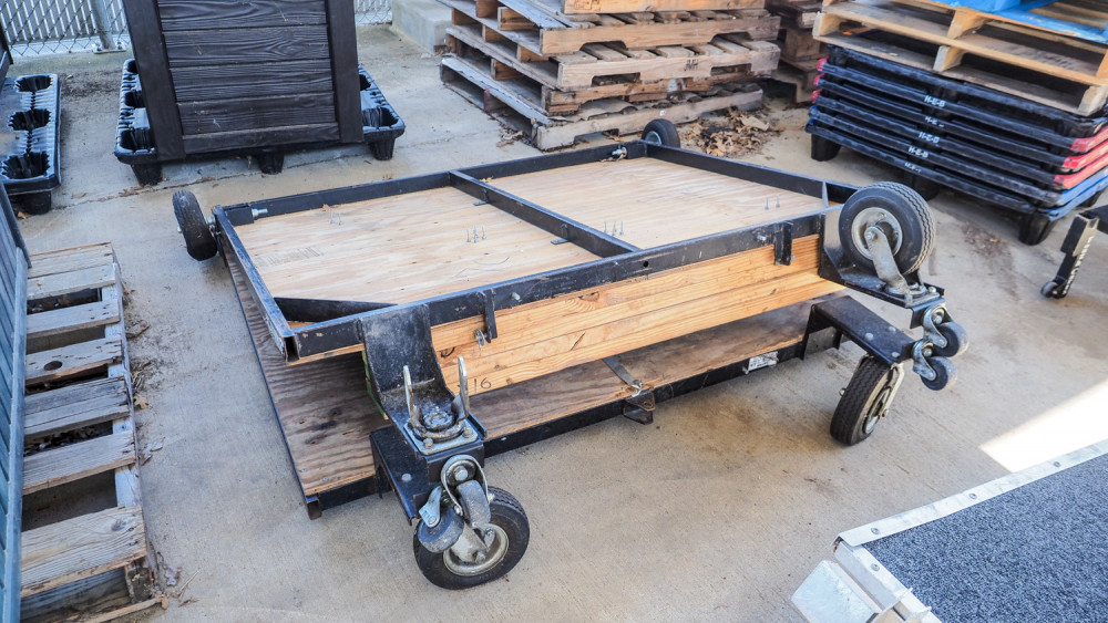 Deck measures. 5 ft x8 ft. Is missing one pneumatic tire. Other tires are flat.
