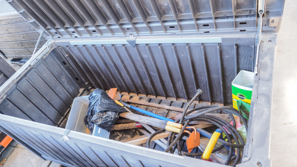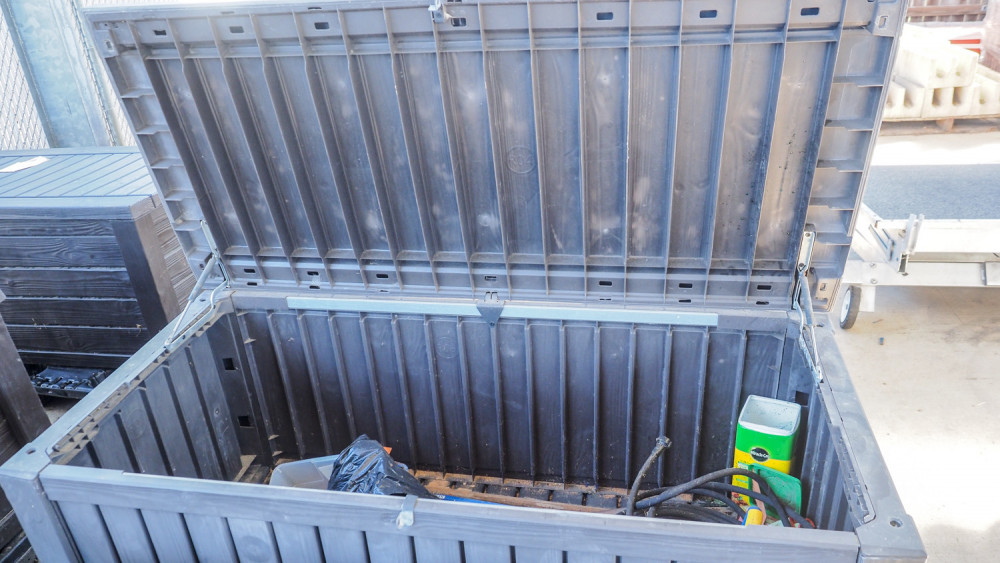 Keter outside storage chest. Measures 60 in × 28 in × 26 in. Made of molded plastic.
