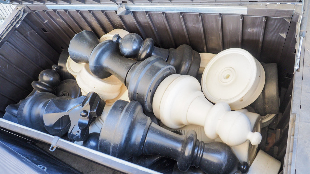 Includes 4 outdoor storage boxes. Snap together. Playing board And chess pieces. There's probably more than one set. But total number of pieces and completeness of sets is unknown. All are contained in heater. Outdoor storage boxes. That measure 5 ft x 28 inches. X 25 inches. One lid is bad. On a box One box has a hole in the lid.