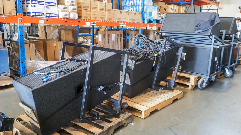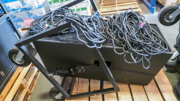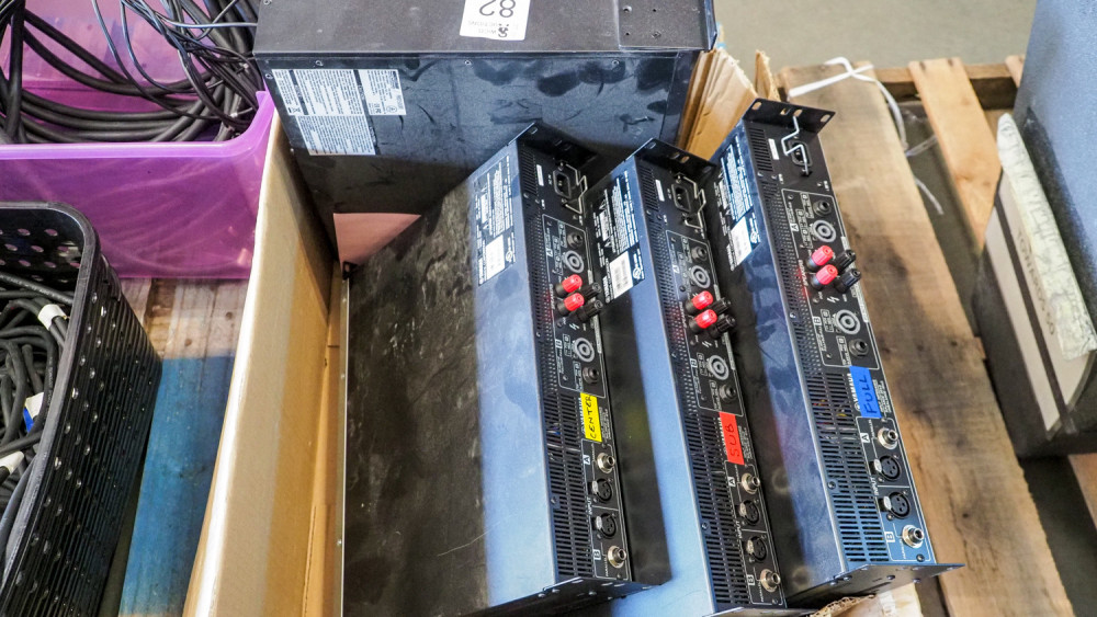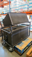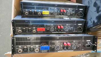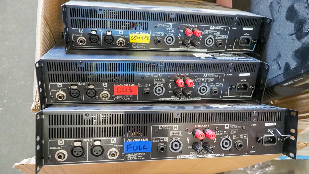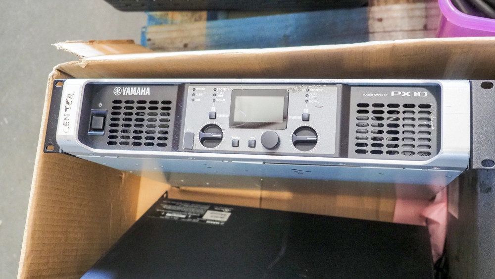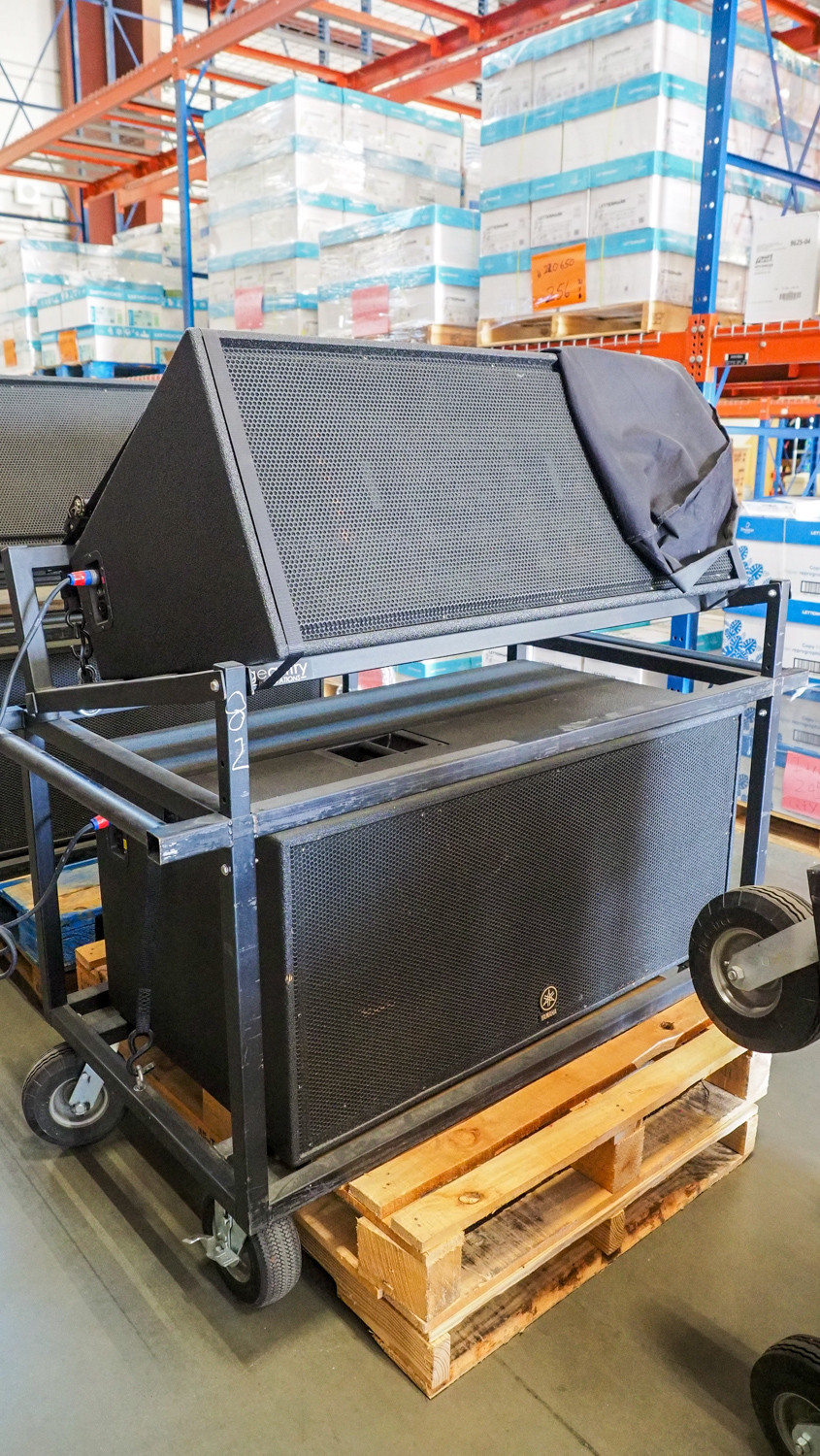 Includes 4 Yamaha C 215 V Speakers And 2 CW 218 V Speakers. All are mounted on rolling pneumatic tire carts. Includes 4 speak on speaker cables. Has a patch panel from amplifier to speaker cables, includes 3 Yamaha PX 10 Digital amplifiers and a Minuteman Pro 1500 RT battery backup. Condition: is working when removed from service.