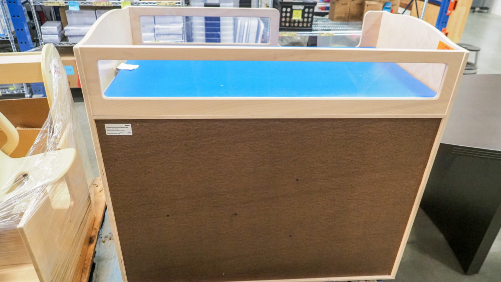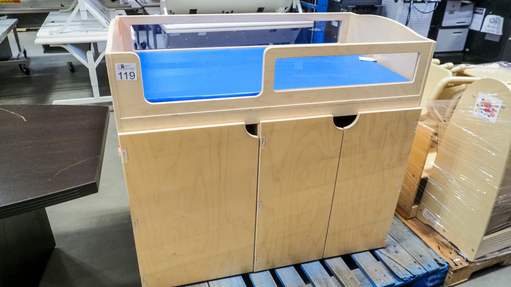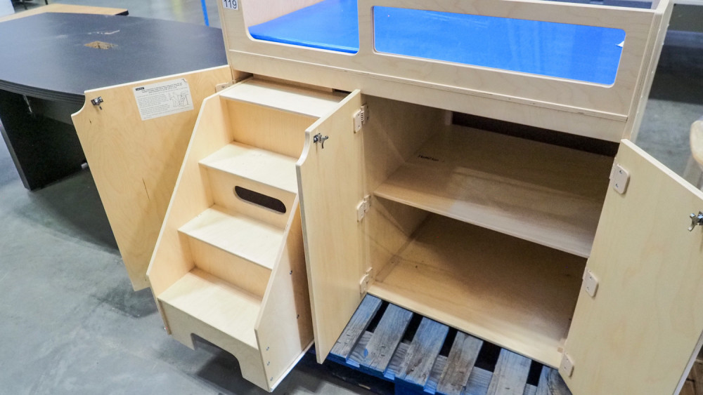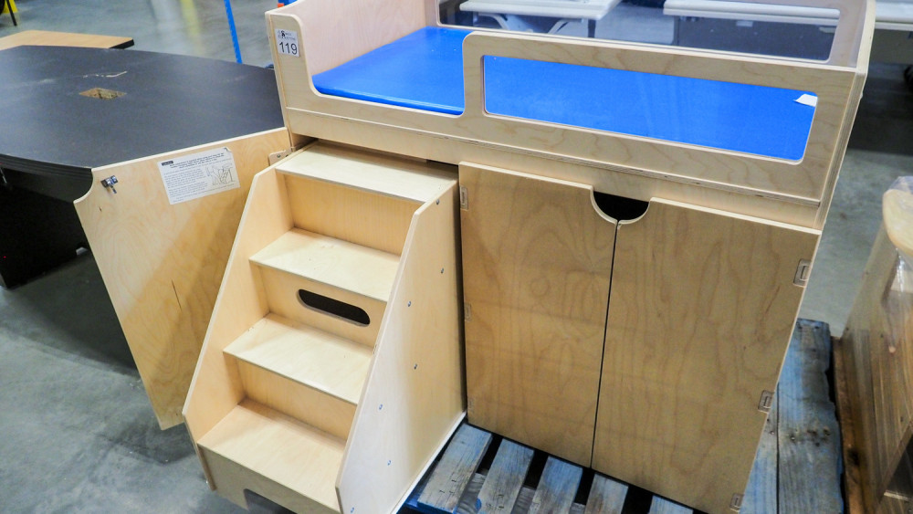 Lakeshore learning. Changing station Measures 44x 25x 38 inches. Includes storage and. Fold out stair well. Correction, slide out. Stairs