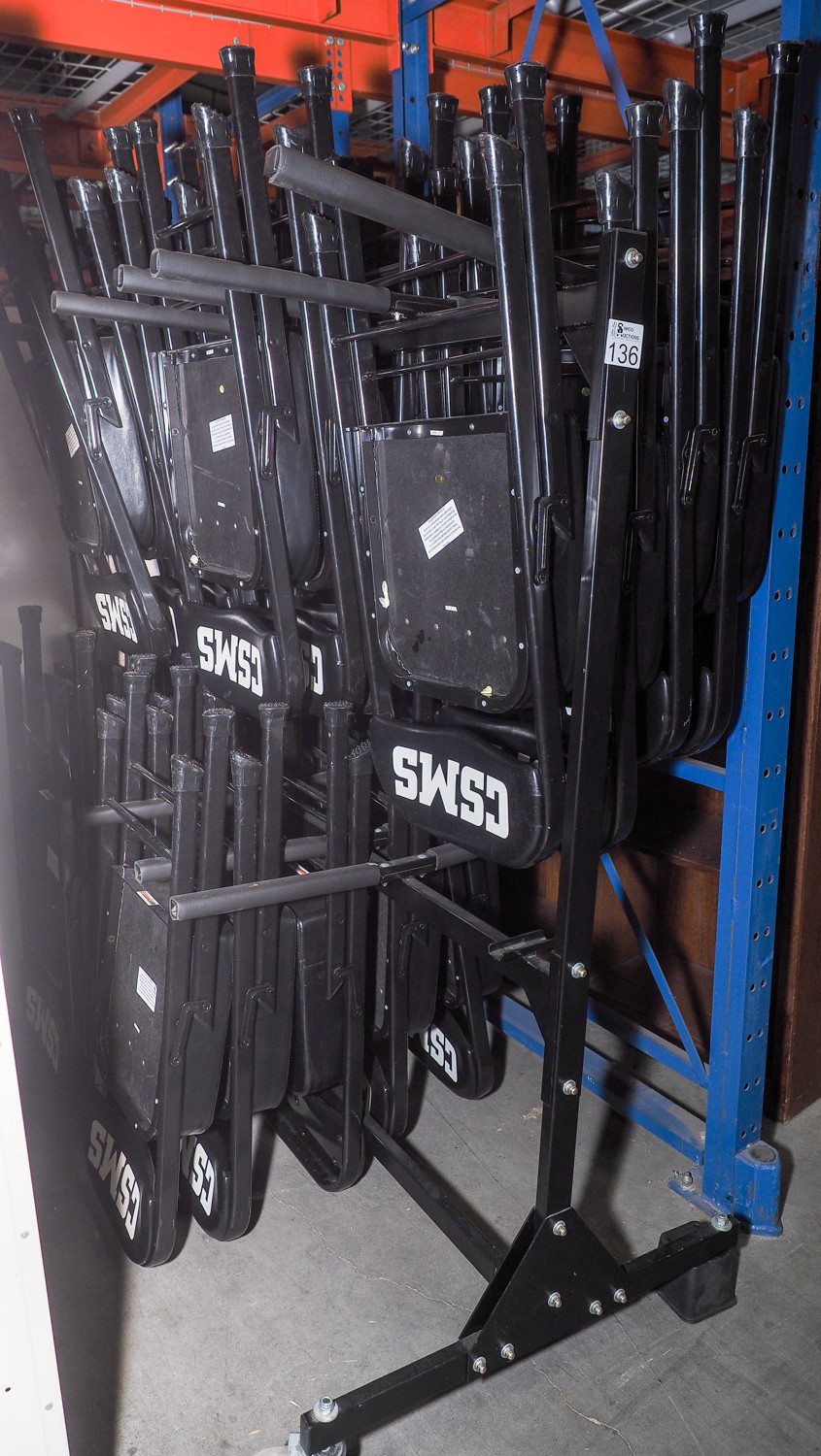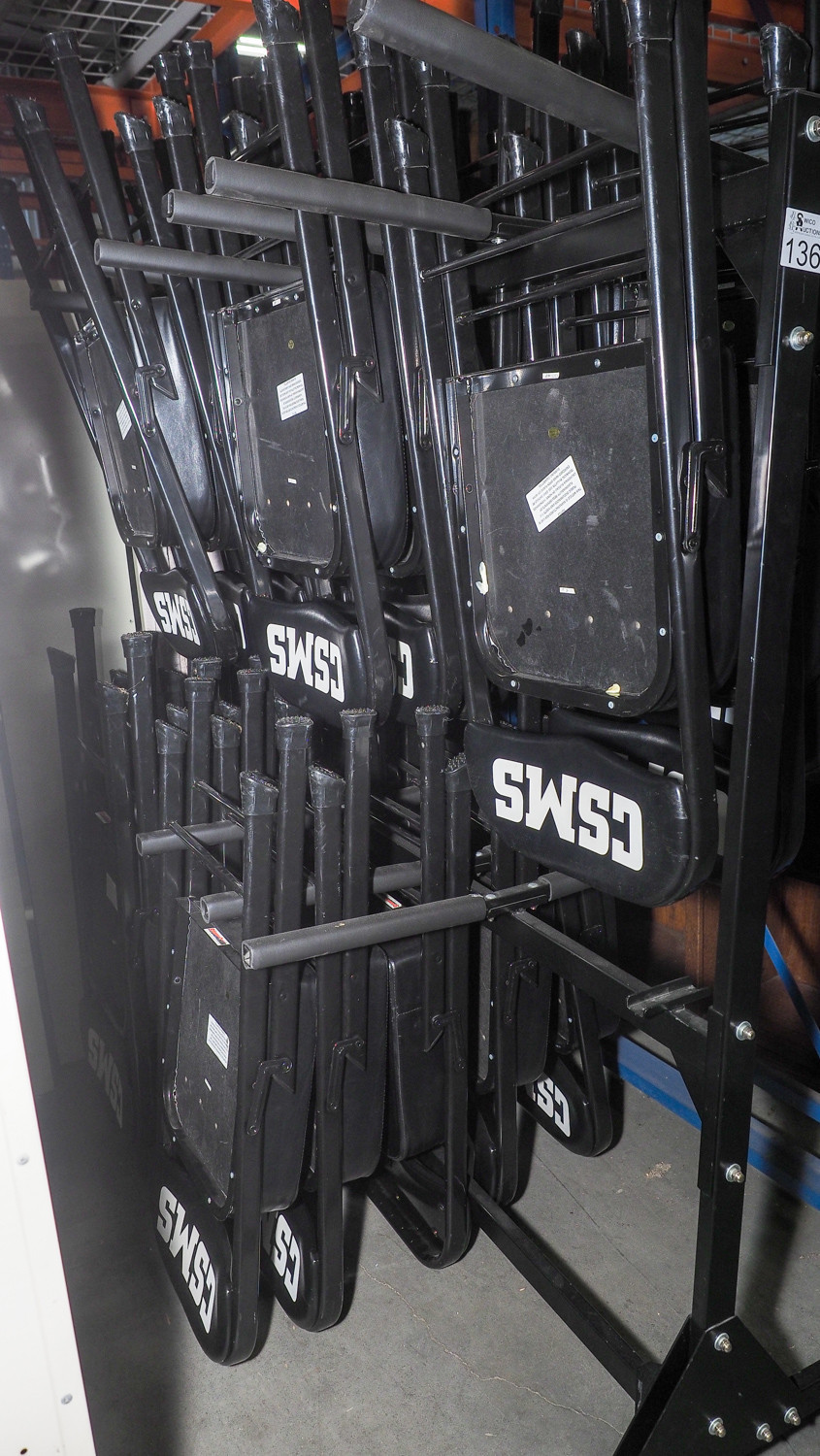 Stadium chair metal folding chairs with padded seats. Also includes. The rack Rack is missing one wheel and other wheels are bending.