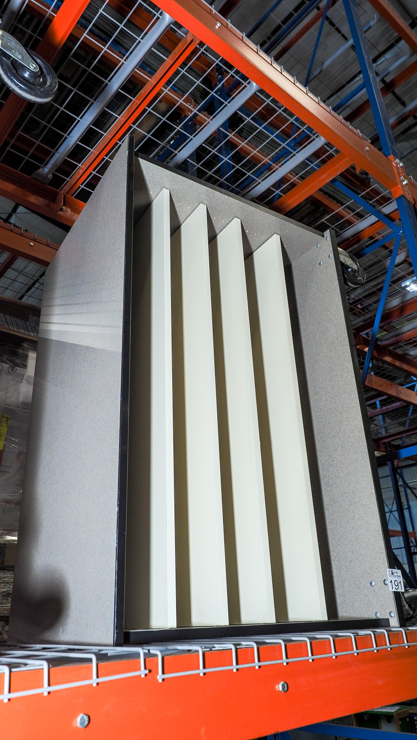 Rolling workstations measuring 48 in × 28 in × 36 in with adjustable shelving.