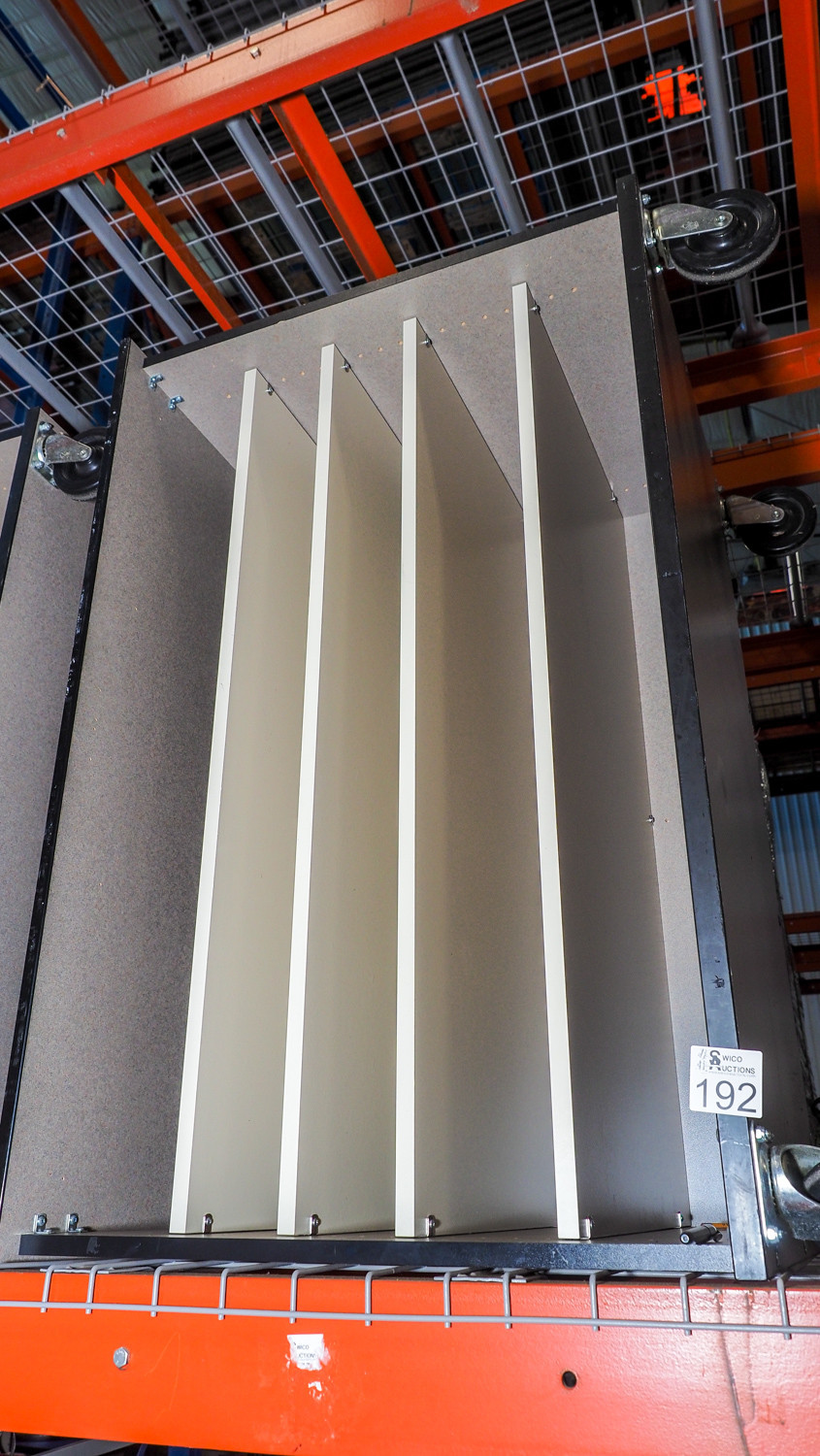Rolling workstations measuring 48 in × 28 in × 36 in with adjustable shelving.