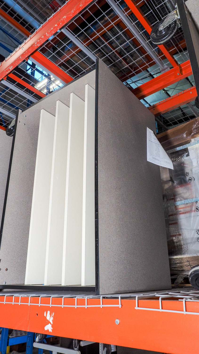 Rolling workstations measuring 48 in × 28 in × 36 in with adjustable shelving.