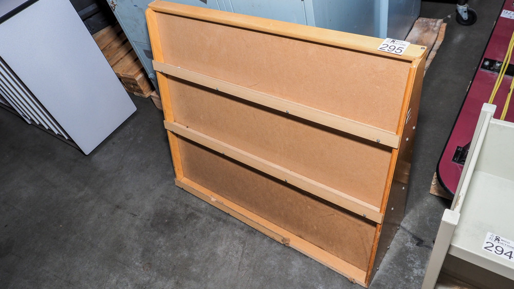 Single-sided wood book rack measuring 36 in × 12 in × 29 in. Condition:Bottom holder rail is broken.