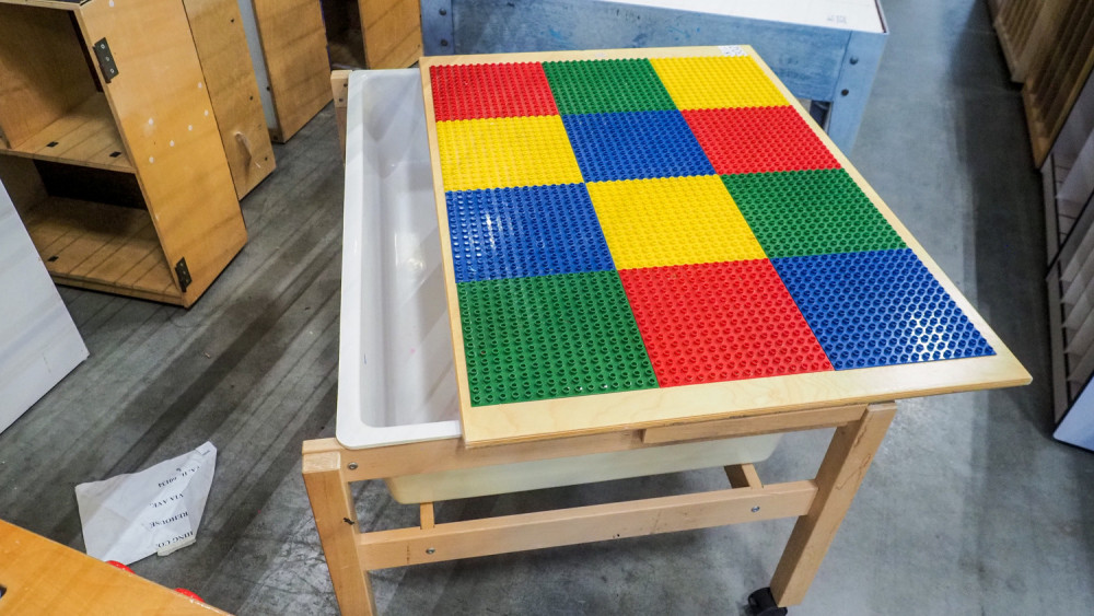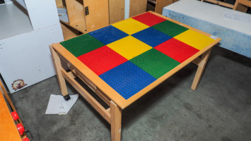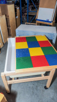 Lego style building block table measures 30. X 42 X 24 inches. With block storage underneath. The lid.