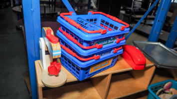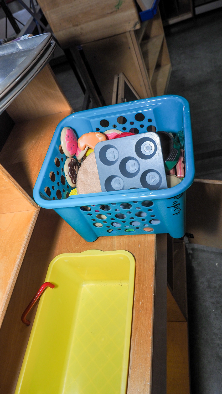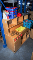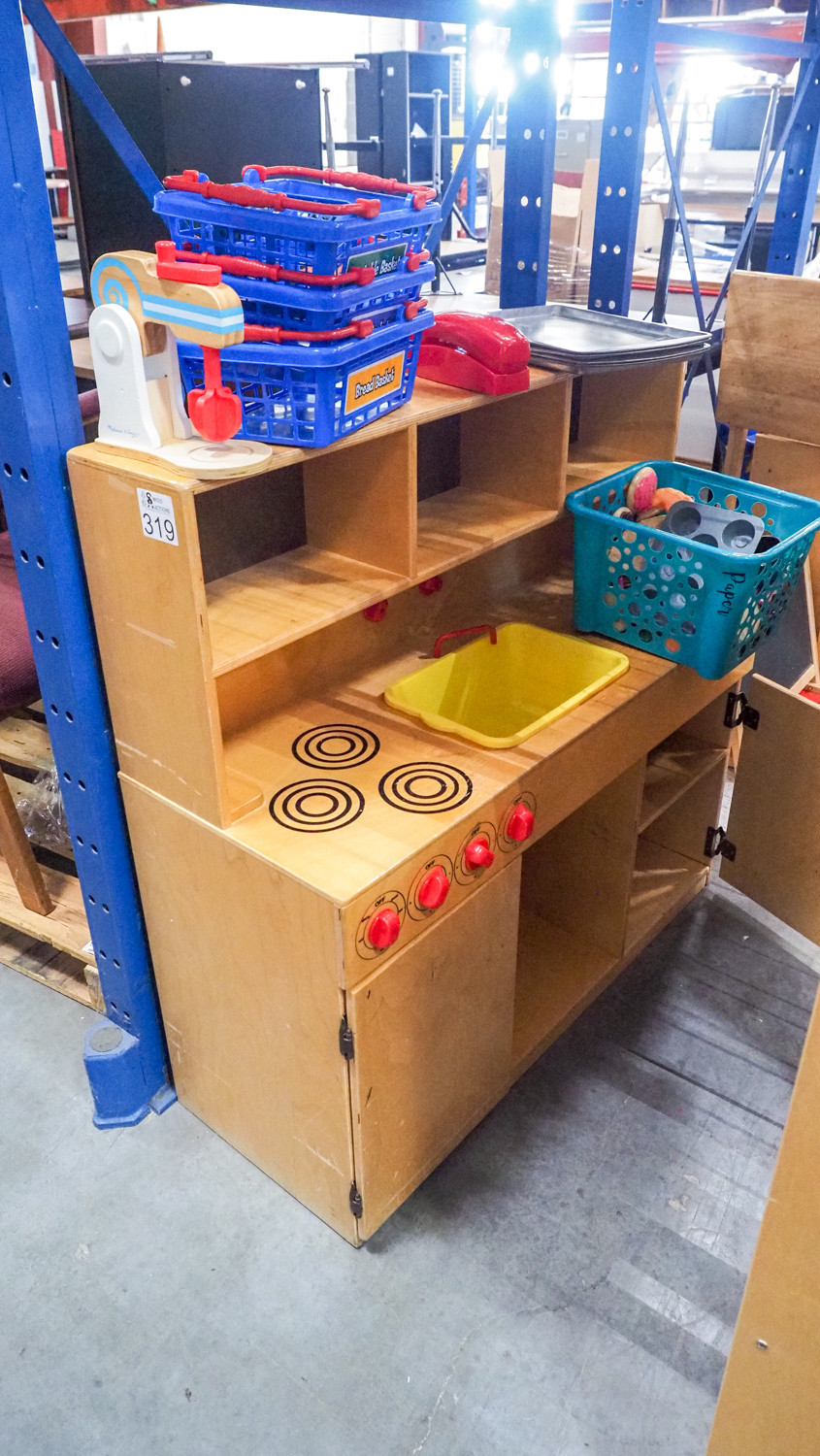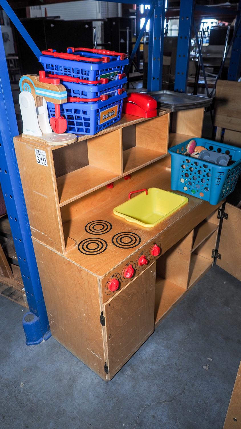 Measures 40x 16 X 40 inches. Includes kitchen accessories like a mixer, Baking pans, Plastic foods, and baskets