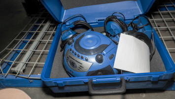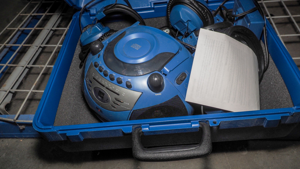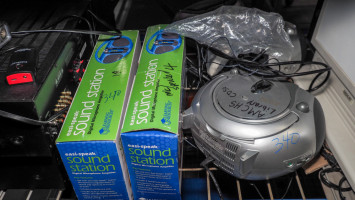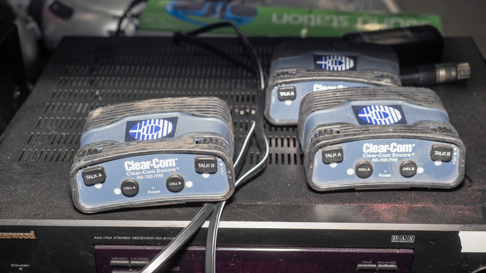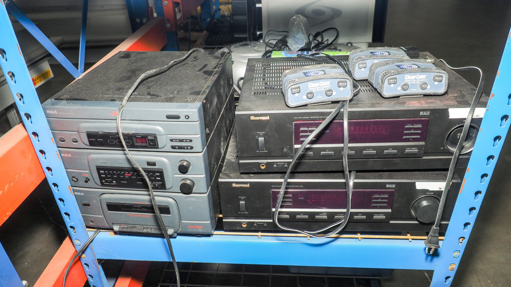 boom boxes, CD players, Sherwood receivers, , clearCom Intercom headsets, DVD writer, keyboard. Also includes a Classroom set of CD player, and headsets.
