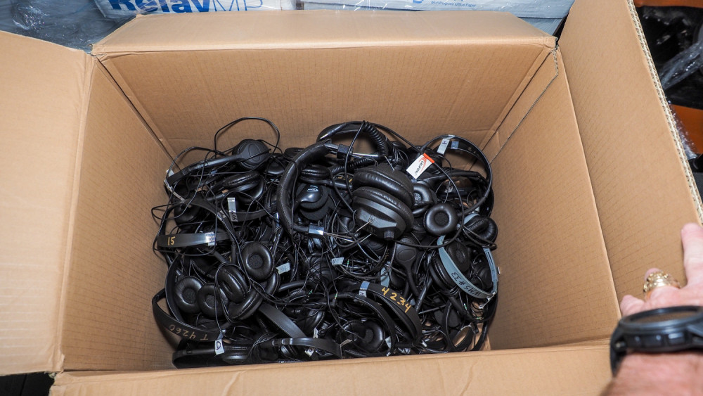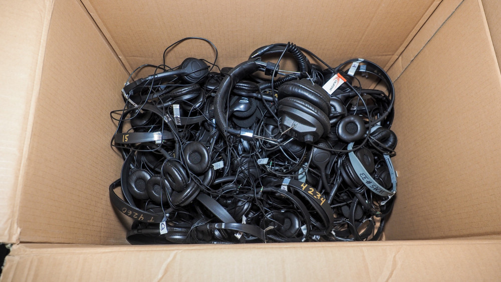 Box of headphones, multiple brands. Condition: unknown.
