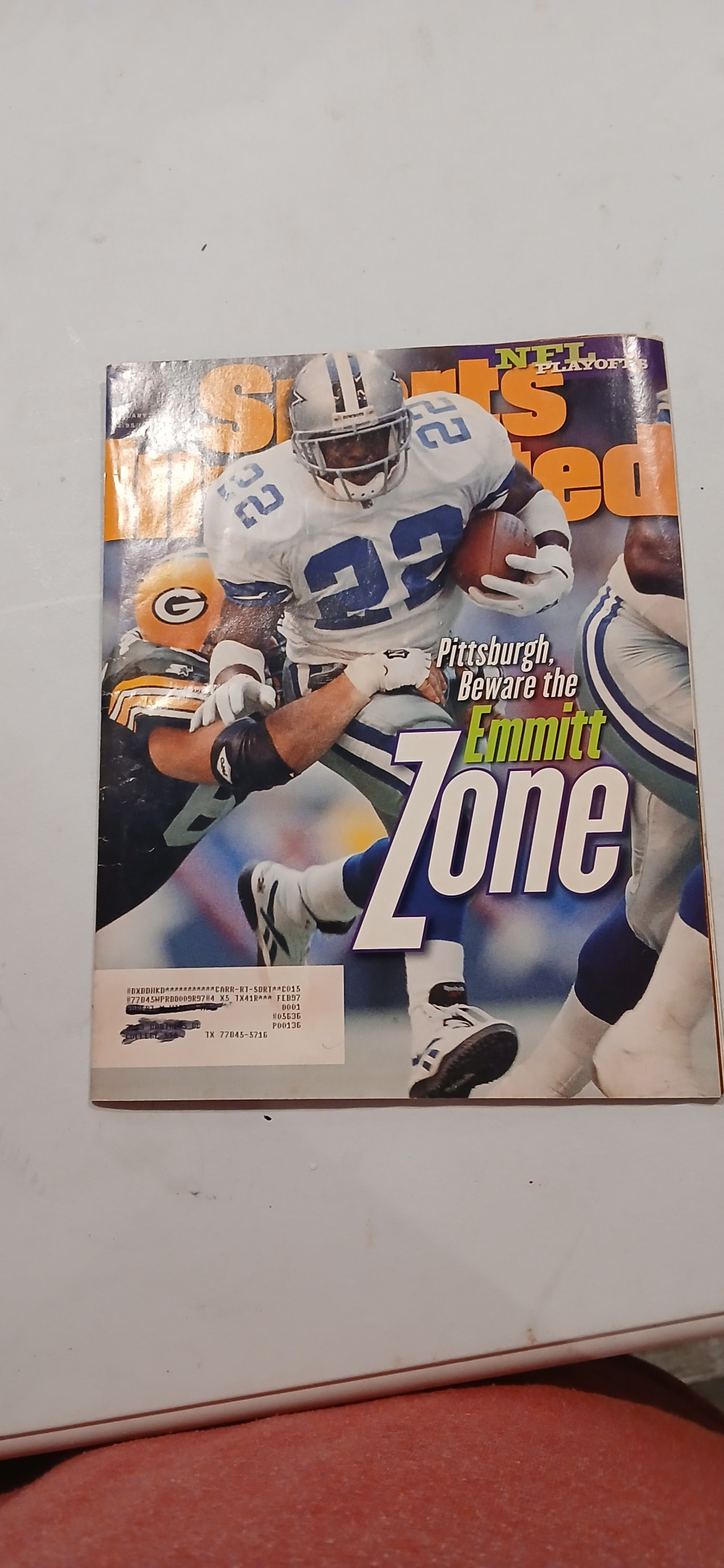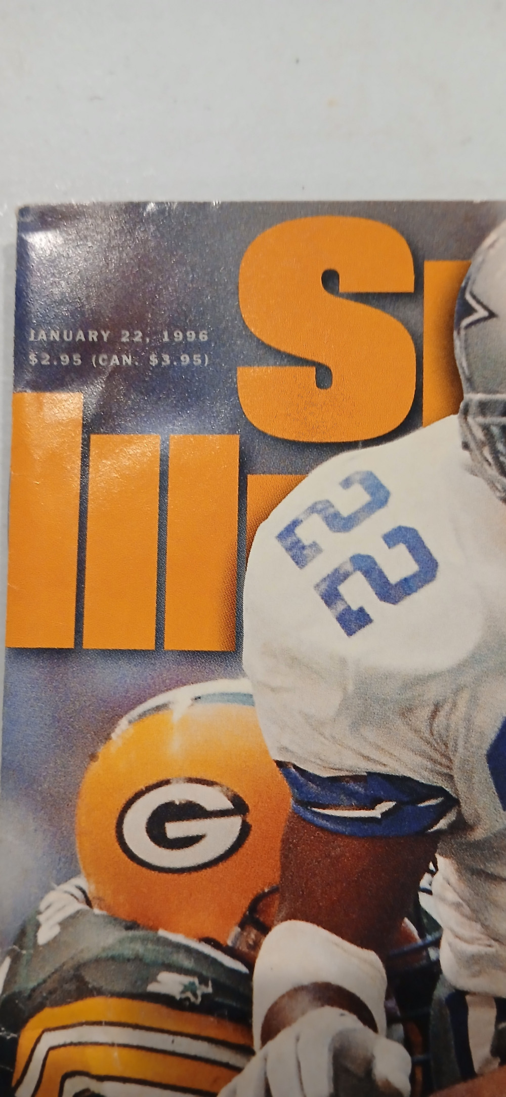 This is a Sports Illustrated 1/22/1996 Edition Emmitt Smith-Dallas Cowboys magazine. Has name and address sticker on it. Some wear on the edges but don't see any tears or writing on it. The front cover has Emmitt Smit running. Remember this magazine is 30+ years old so NOT brand new nor in perfect condition. Great item for any Dallas Cowboy or Emmitt Smith collection!