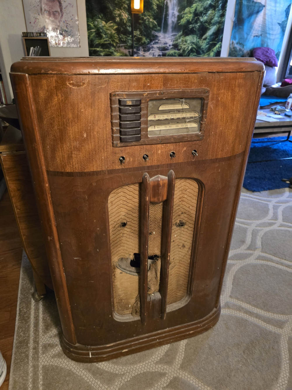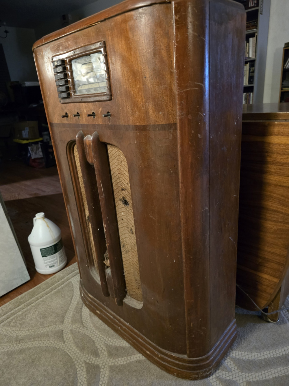 Cosmetics: The "waterfall" walnut cabinet and vertical grille bars are in good vintage shape.