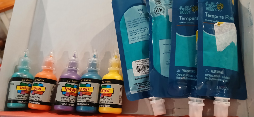 Lot includes 3 packets of Tempura paints (not sure of color) and 5 bottles of assorted color 3D paints. These have been in storage in my closet for a couple years, bought them for a person who isn't painting anymore so don't need them anymore.