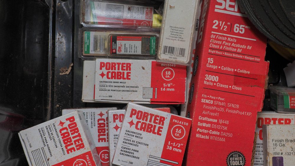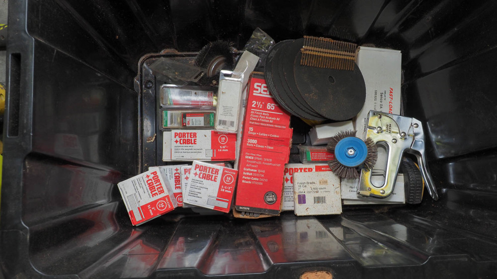 7” cutoff blades, hand stapler, finish nails, crown staples, 15 guage finish nails, 16guage finish nails, 18 guage nails, wire wheels.