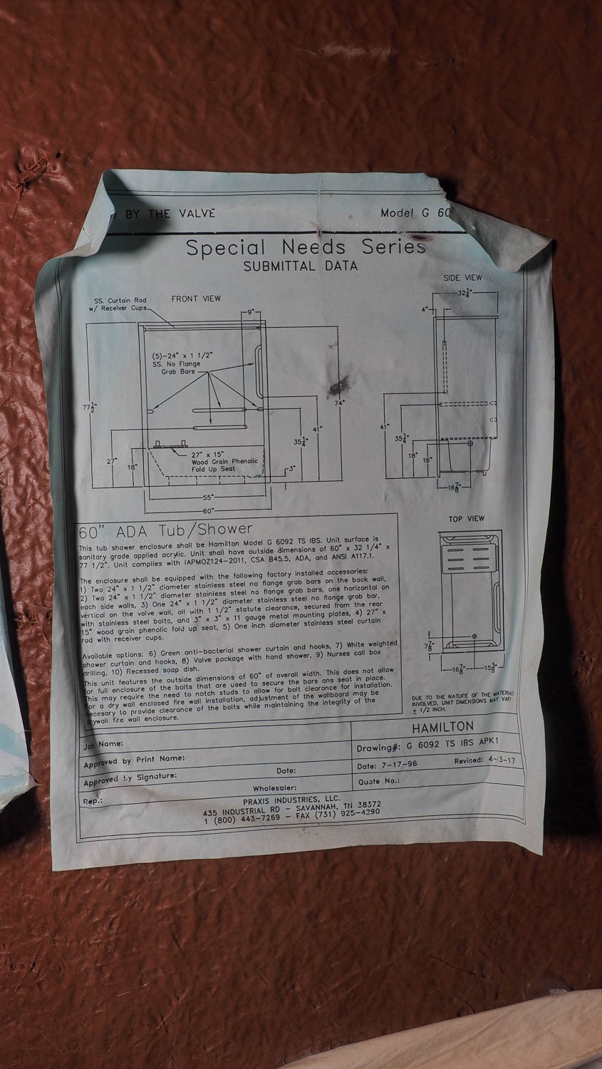 60” Special Needs shower. Has 5 grab bars, fold down seat. Shower curtain rod. 60x 32.25, 77.5”
