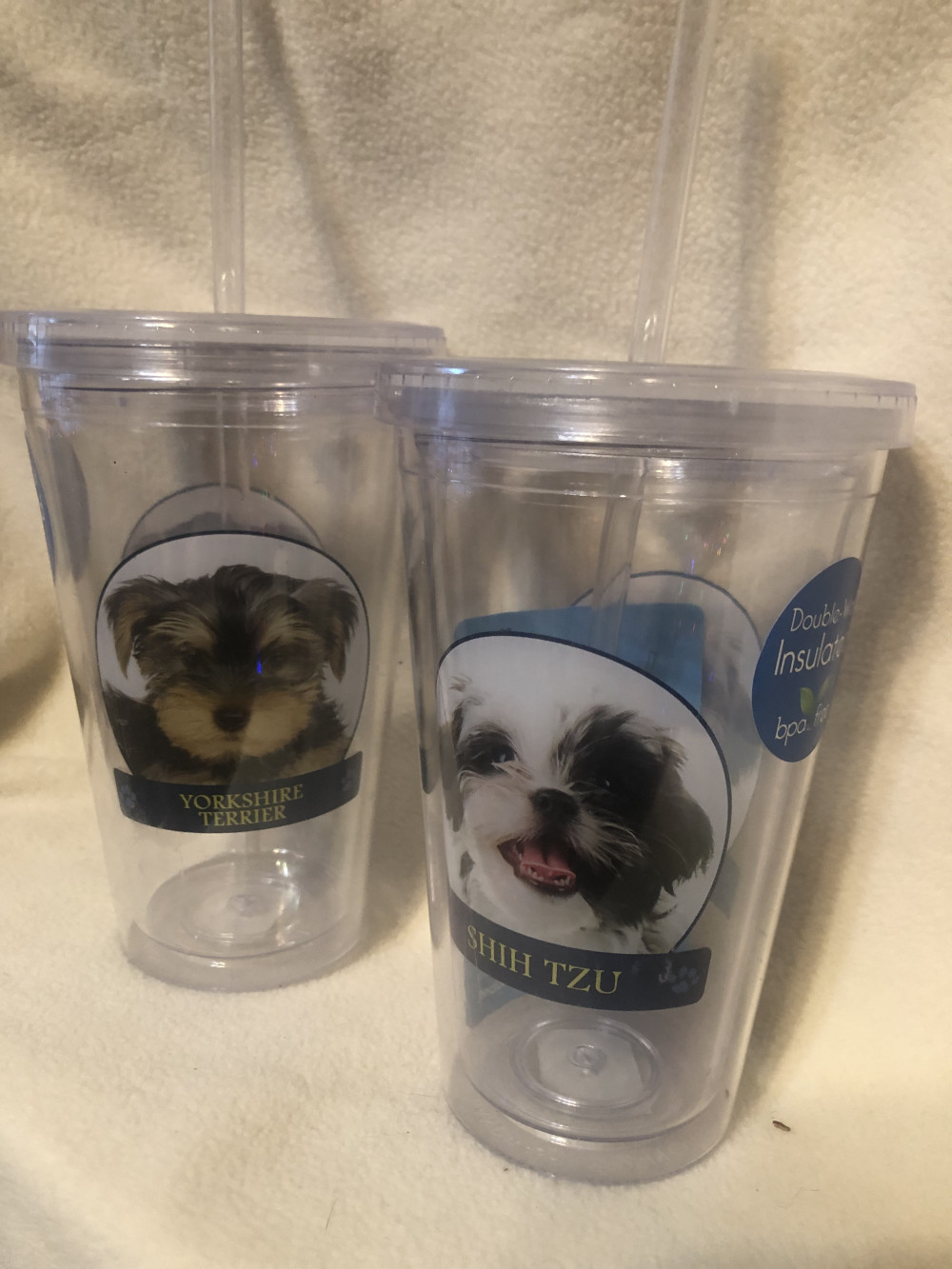 New, never used, 2 adorable dog themed drinking cups. Each cup had lid and straw. Both are BPA free and double insulated. 1 cup is a Shih-Tzu and 1 cup is a Yorkshire Terrier.