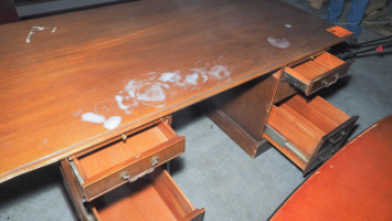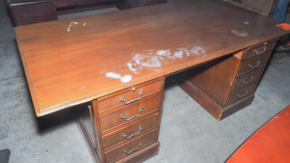 Executive wood desk measuring 38x76" with six drawers and two slide-out writing boards. *The University of Texas at Austin makes no claim of physical or mechanical , and functionality of items available through SWICO Auctions. All items are sold “As is, where is”. It is the sole responsibility of the bidder to physically inspect items before bidding and assume all risk. Photos and descriptions are for preview only. All sales are final and no refunds will be issued. Please refer to the SWICO “Terms of Service” in which you have agreed to.
