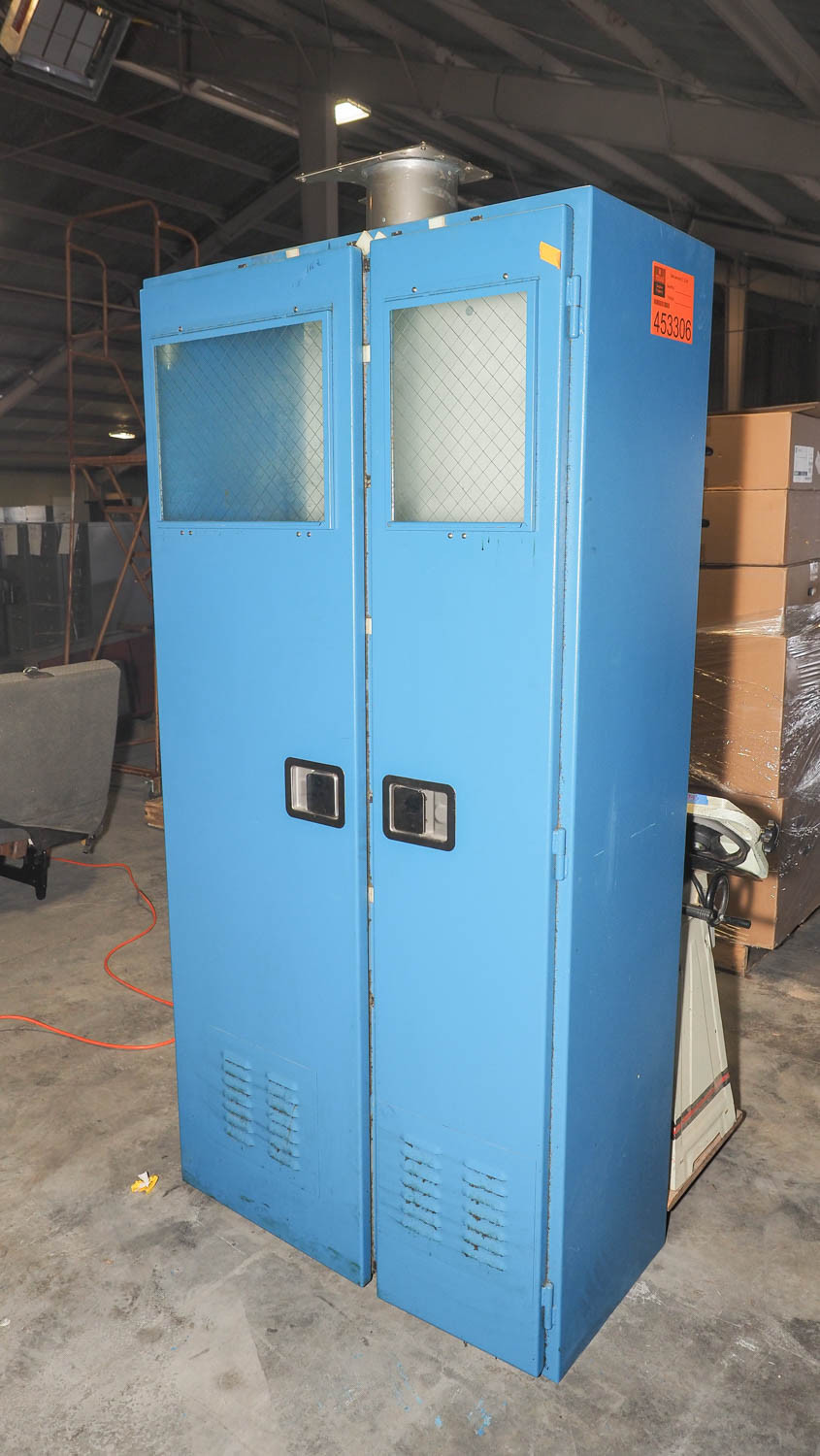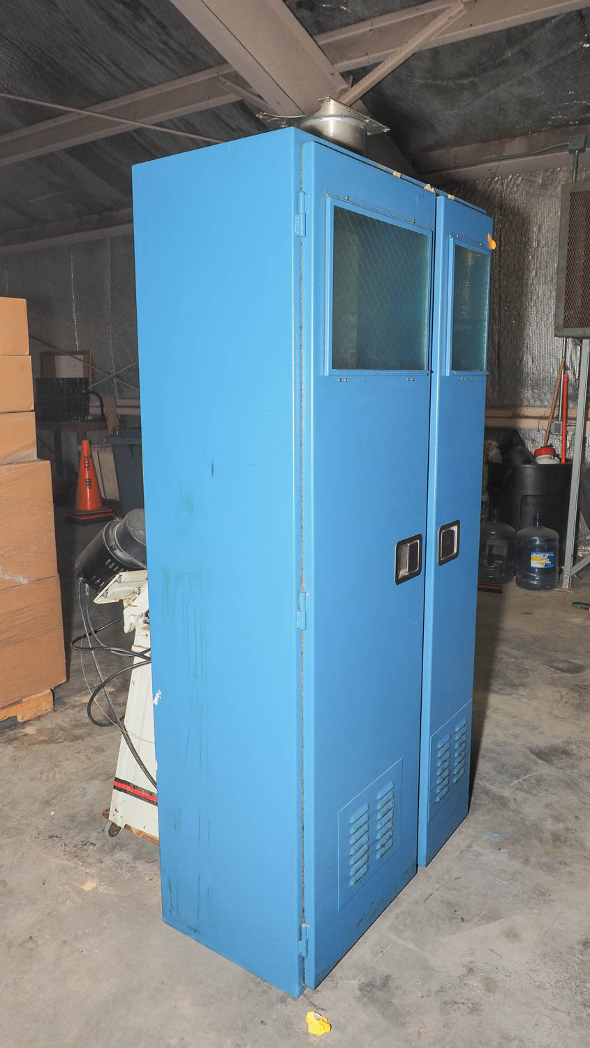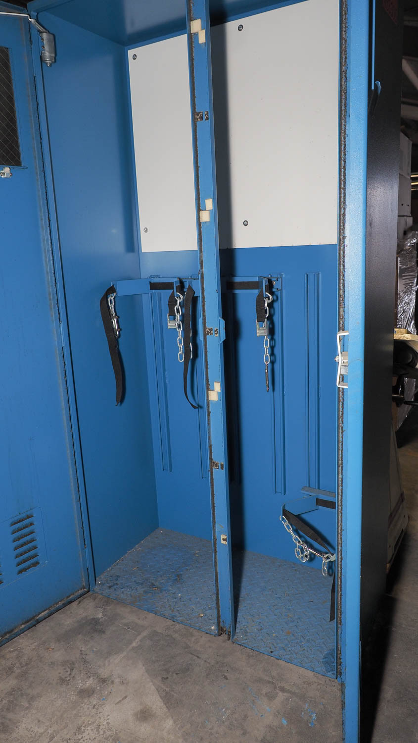 Blue gas bottle storage cabinet measuring approximately 36x18x78" overall. *The University of Texas at Austin makes no claim of physical or mechanical , and functionality of items available through SWICO Auctions. All items are sold “As is, where is”. It is the sole responsibility of the bidder to physically inspect items before bidding and assume all risk. Photos and descriptions are for preview only. All sales are final and no refunds will be issued. Please refer to the SWICO “Terms of Service” in which you have agreed to.