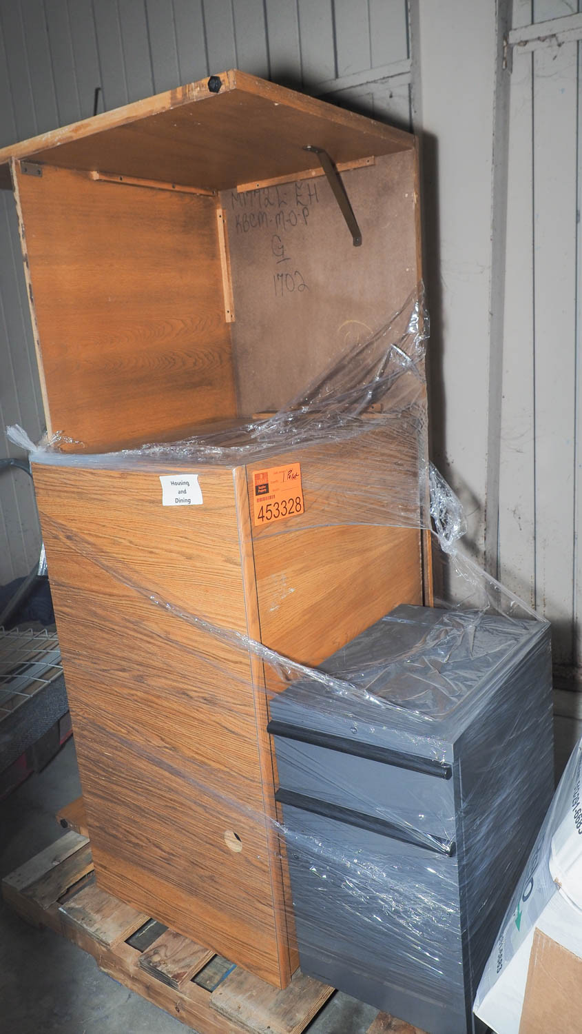 L-shaped desk and metal two-drawer file cabinet. *The University of Texas at Austin makes no claim of physical or mechanical , and functionality of items available through SWICO Auctions. All items are sold “As is, where is”. It is the sole responsibility of the bidder to physically inspect items before bidding and assume all risk. Photos and descriptions are for preview only. All sales are final and no refunds will be issued. Please refer to the SWICO “Terms of Service” in which you have agreed to.
