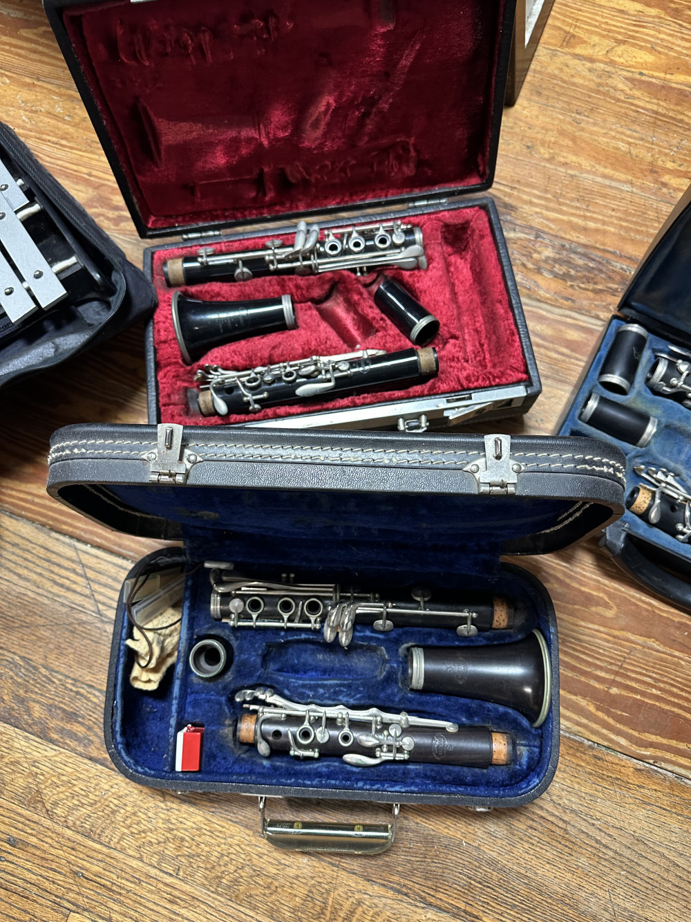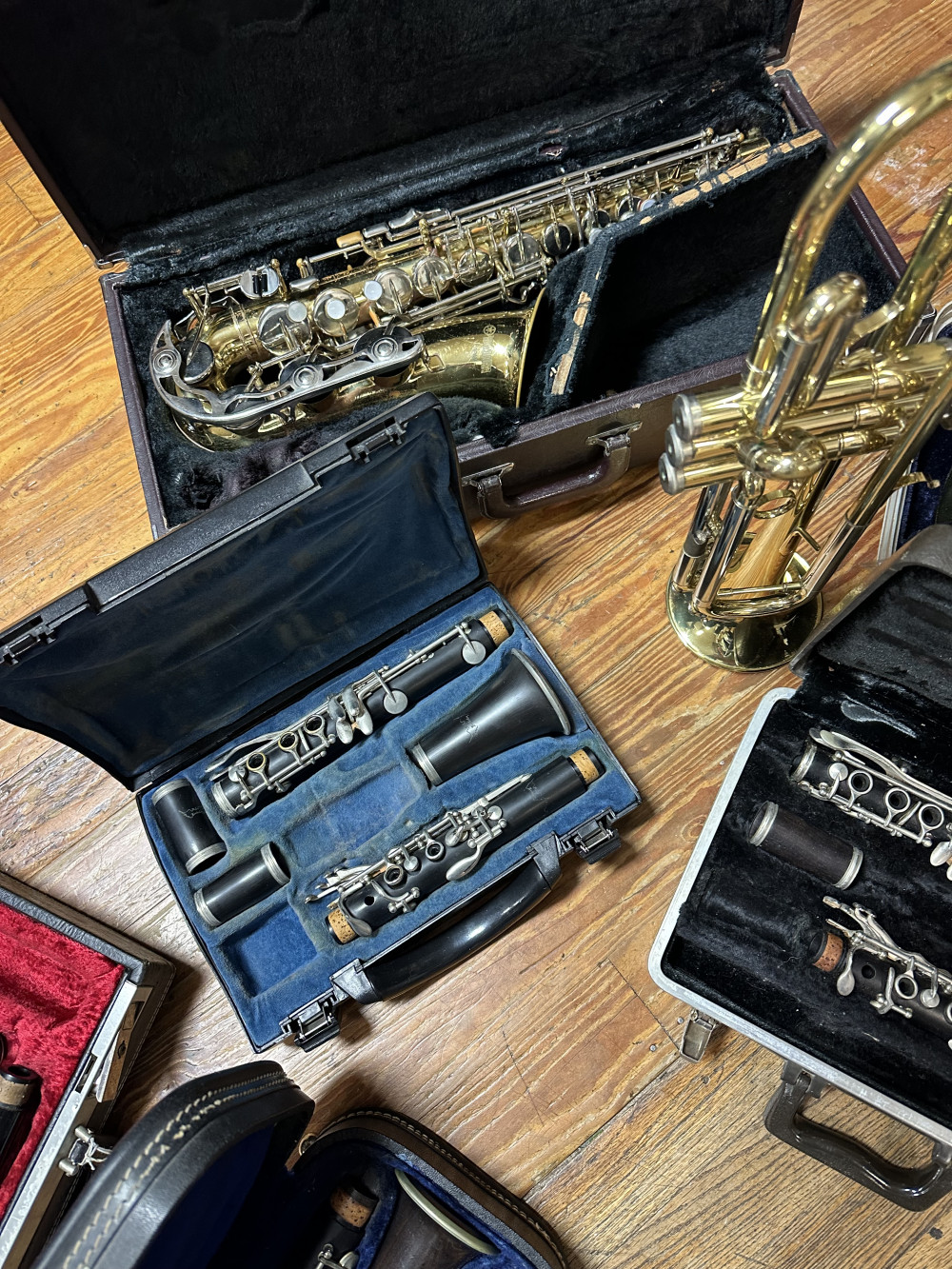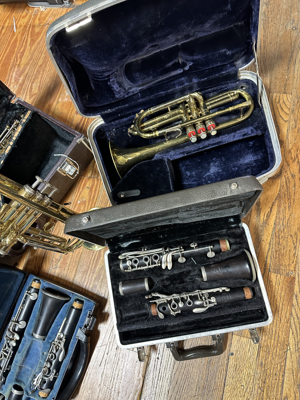 Lot of musical instruments in various conditions. Great for wall hangings, repair and resale or parts. 1 trumpet 1 cornet 1 bell set 1 saxophone 4 clarinets