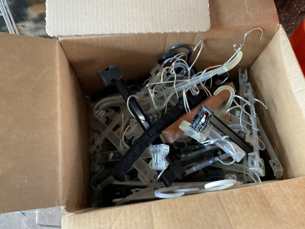 Large lot of closet items. Tie hangers, belt hangers, shoe trees, clothes hangers, over door hangers.