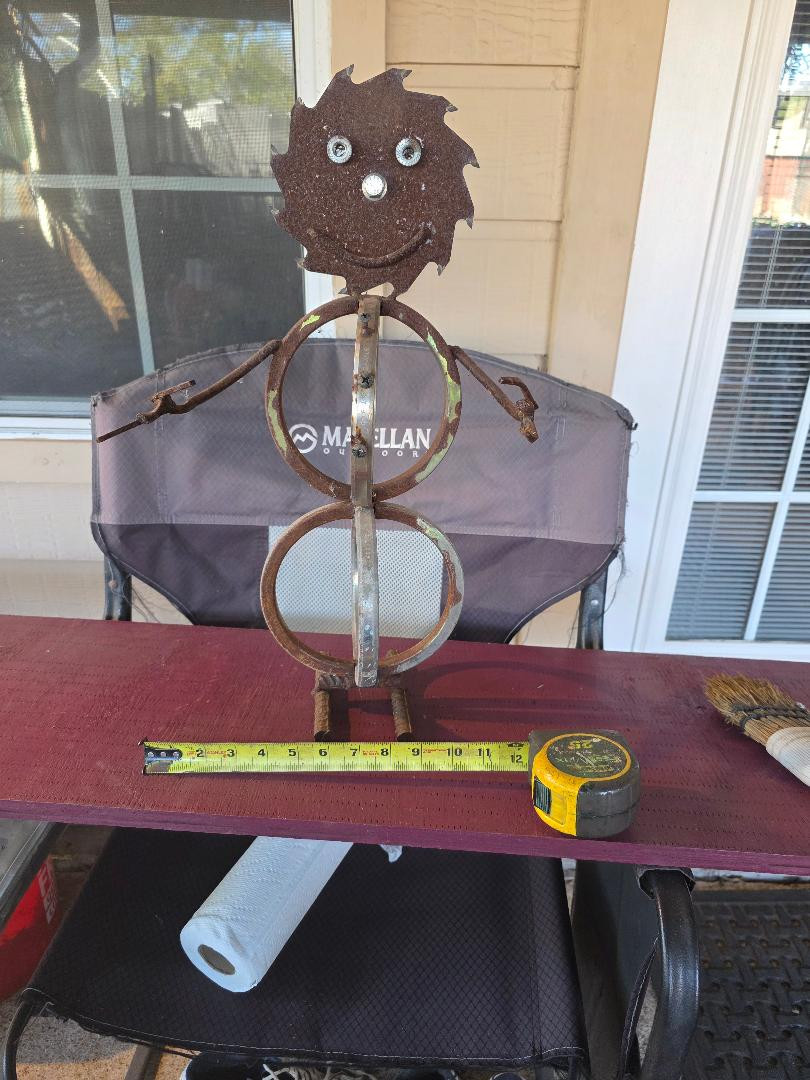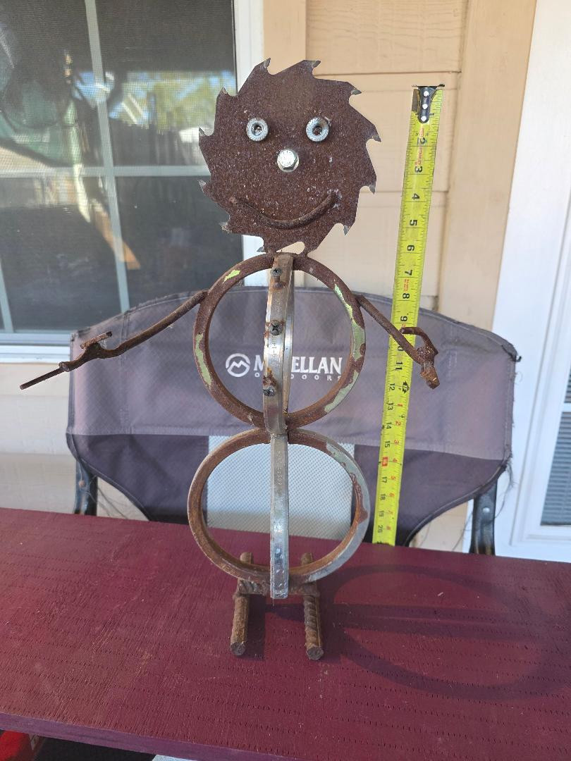 This is a snowman made from various pieces of metal. He is approximately 20 inches tall and 12 inches wide.