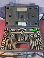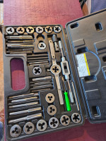 This tap and die kit features 17 taps and dies in a wide selection of metric measurements. The set includes taps, dies, wrench handles, a screwdriver and screw pitch gauge .