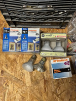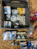 Lot of large and small flood lamps. Two are infared lamps. Small bag of candelabra lamps.