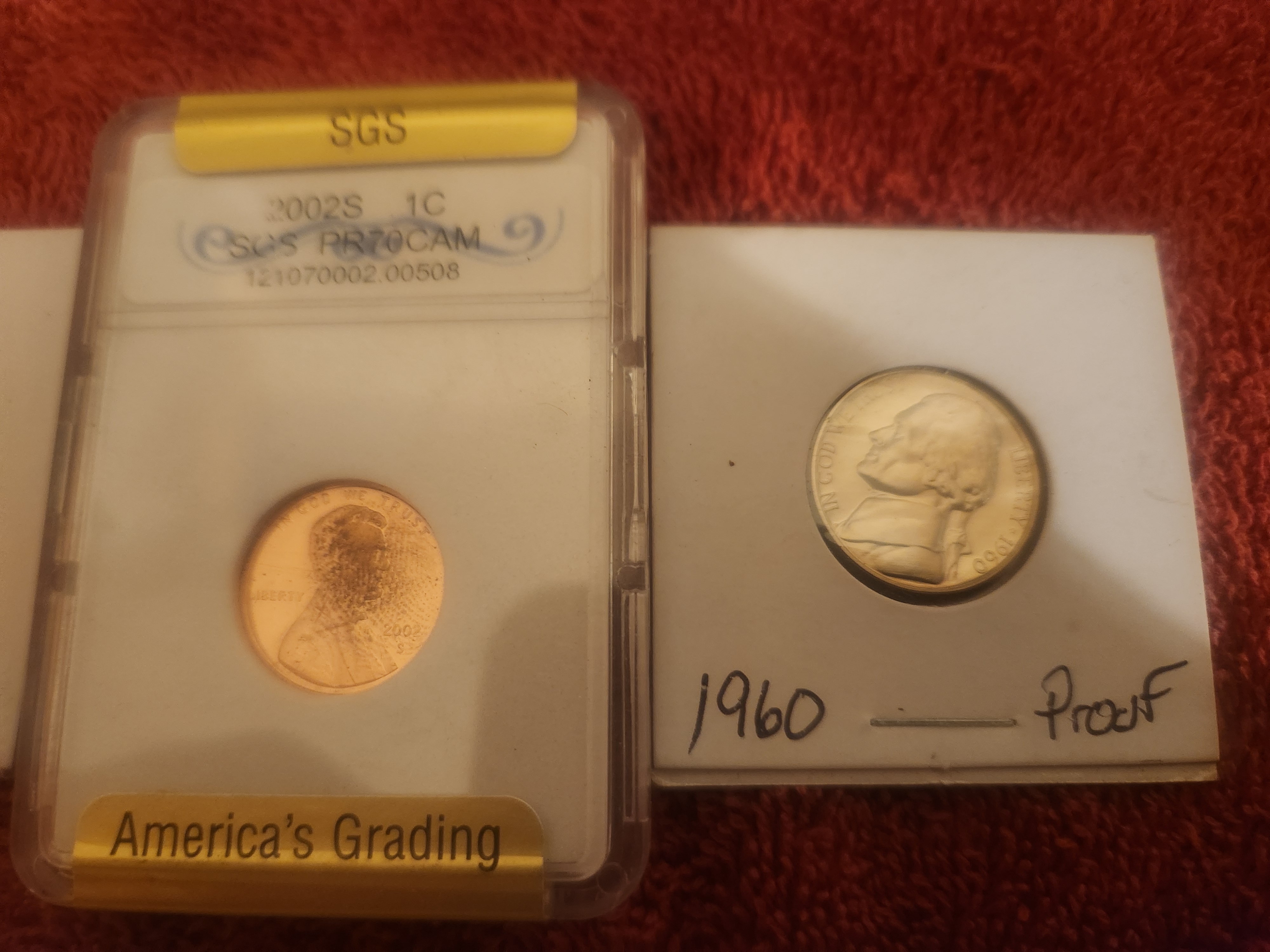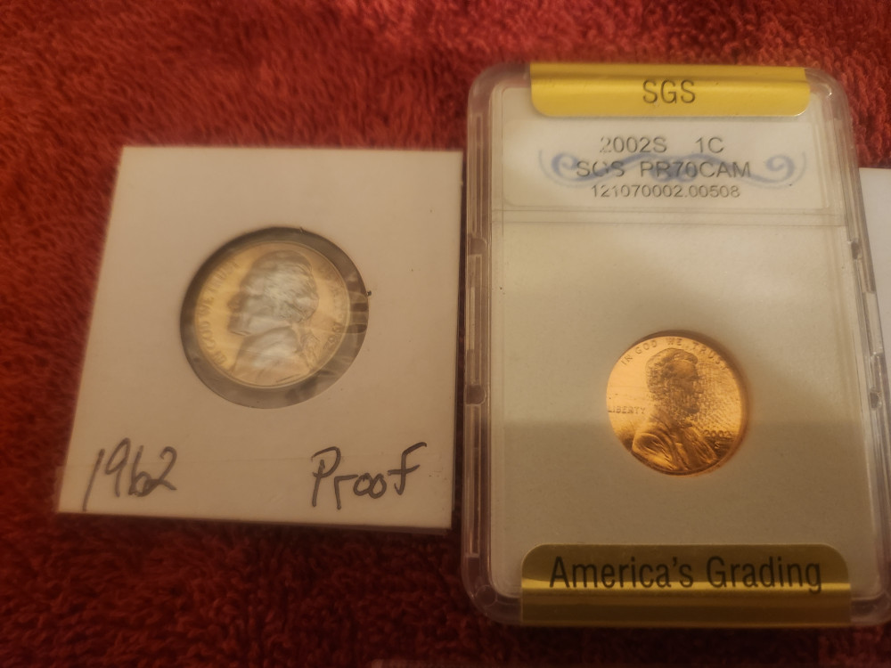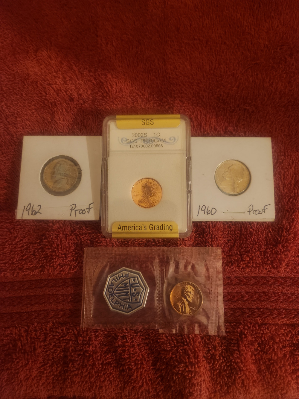4 coin proof lot Graded 2002-S PR70 CAM, 1962 proof penny, 1960 proof nickel and a 1962 proof nickel.