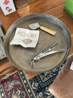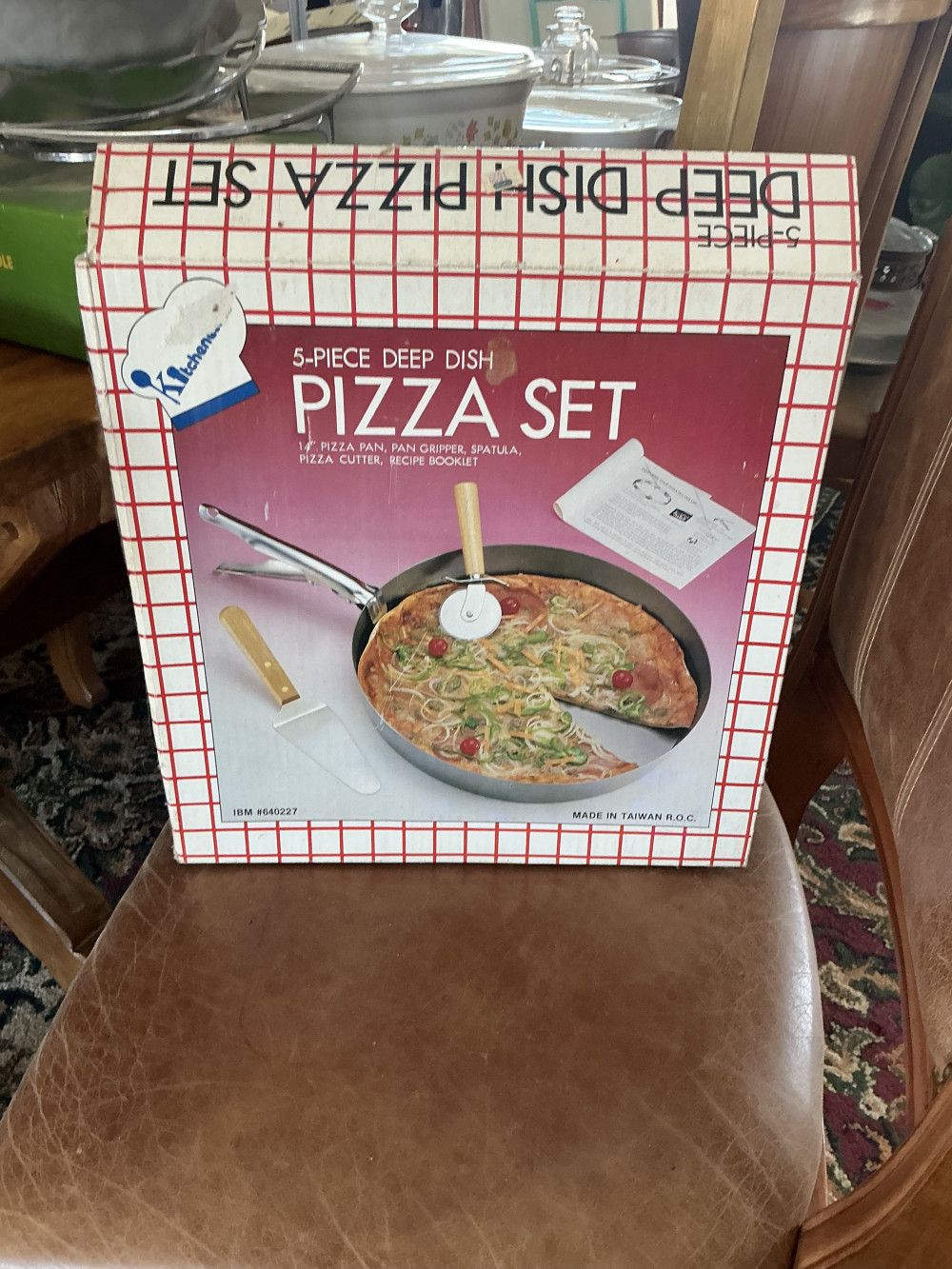 Recipe book, pizza cutter, pan gripper, 14” deep pan, missing spatula, lightly used.
