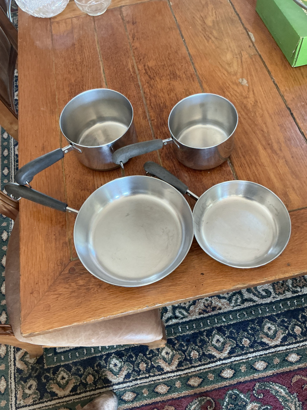 Set of four by Revereware, 7 & 9” frypans plus 1-1/2 & 2 qt pans