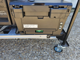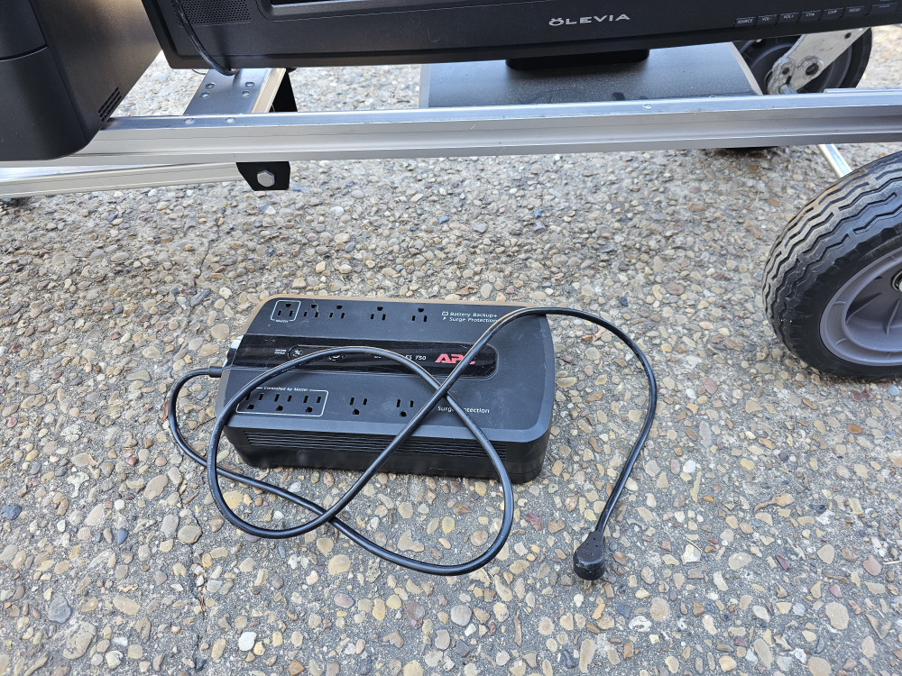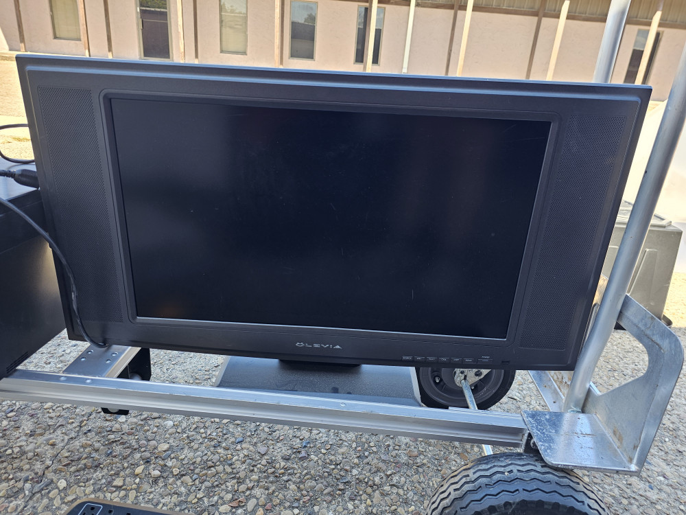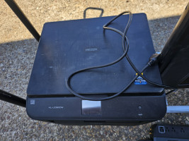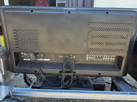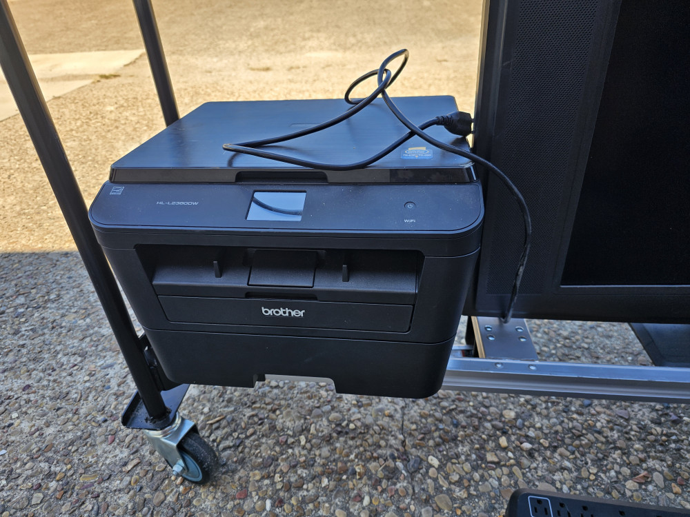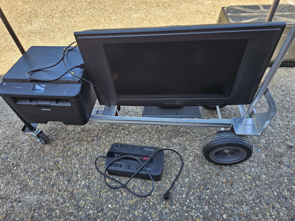 Large brothers combo printer. Large LCD display monitor. And large back up battery/surge protector/power distribution box. As is as pictured. Cart not included