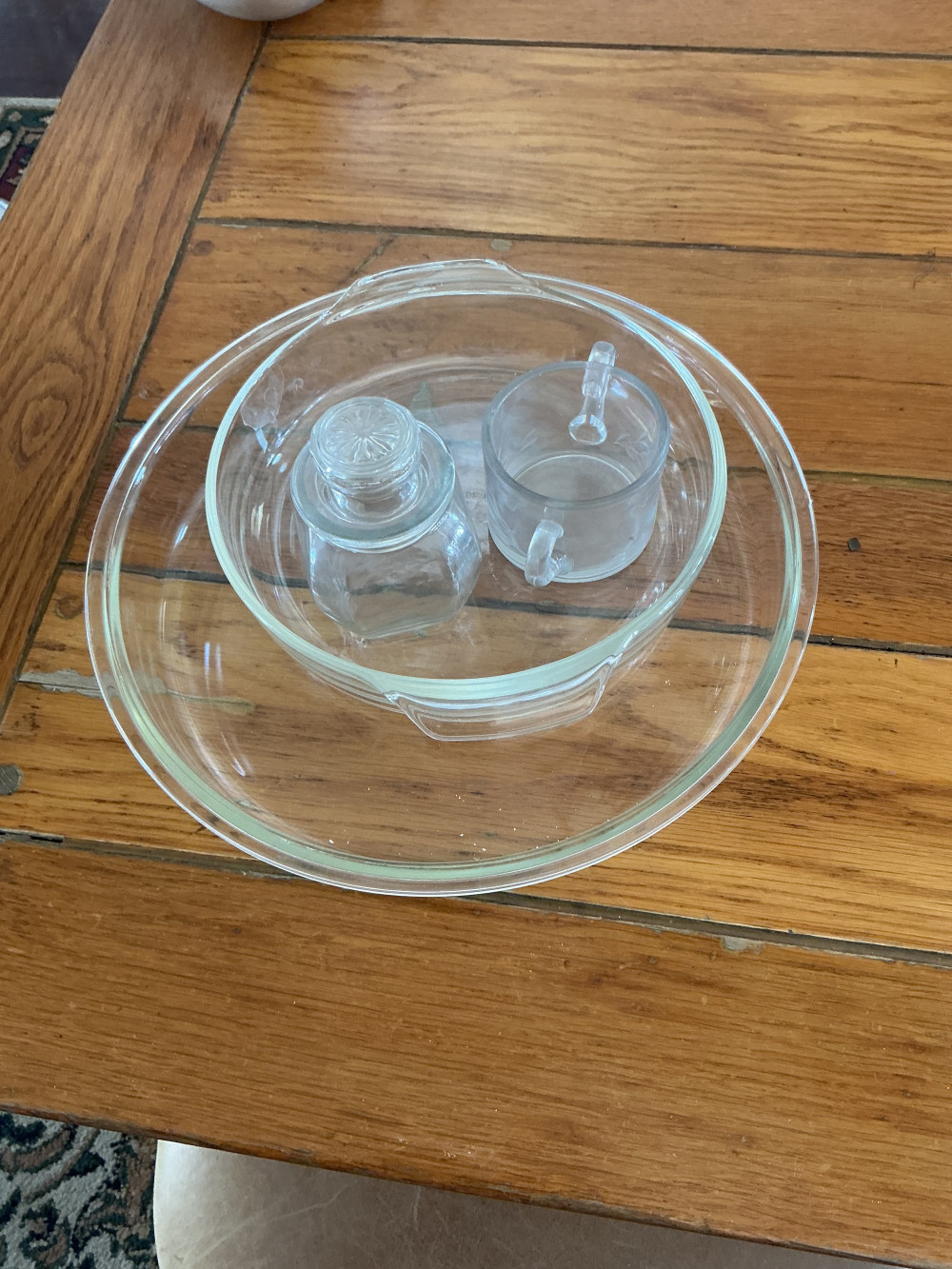 Four pieces, 11” & 8.5” pans, cup and small decanter